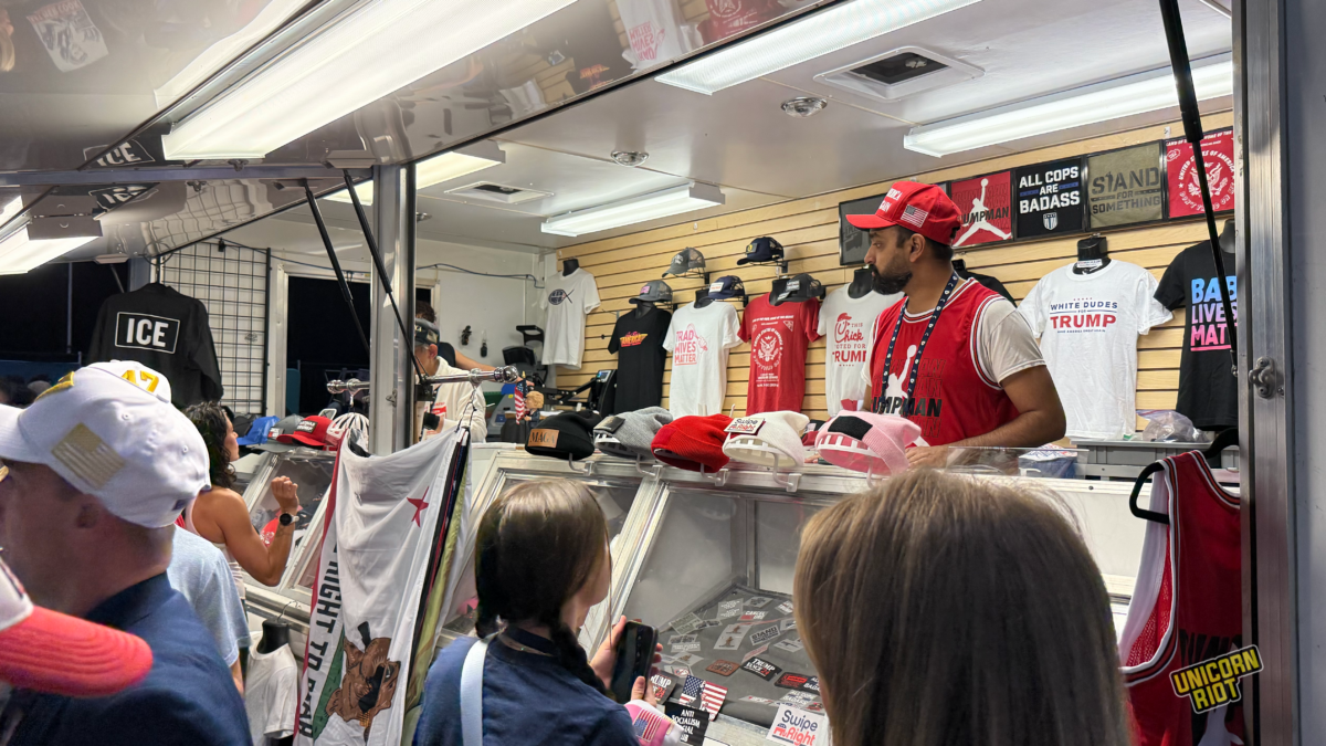If attendees forgot to buy MAGA merch from the various entrepreneurial vendors outside the convention center, there were several in the exhibit room making hand-over-fist profits, selling “Let’s Go Brandon” shirts nearly a year after Joe Biden left office and black windbreakers with “ICE” emblazoned on the back in big, bold letters.