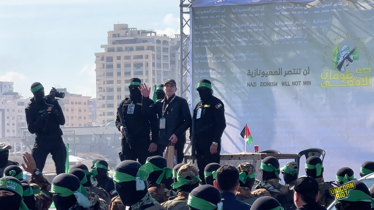 A week earlier, on Saturday, February 1, Unicorn Riot documented the moments that American-Israeli captive Keith Siegel, 65, was handed over to the International Committee of the Red Cross in Gaza City. Siegel was taken captive and brought into Gaza on October 7, 2023, along with his wife, Aviva, who was released in an exchange in November 2023.