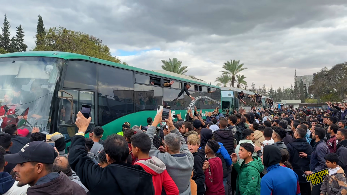 After the Israeli captives reached Israeli soil, buses carrying 183 Palestinians from multiple prisons were brought to three drop-off points — Khan Younis, Gaza, the occupied West Bank, and occupied East Jerusalem.