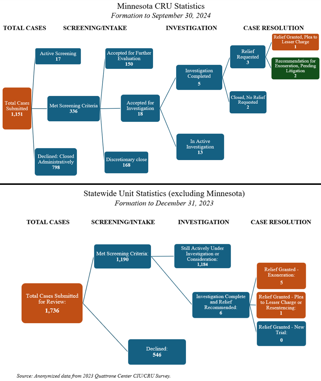 Minnesota’s CRU began operations in April 2021 and started taking applications in August 2021. At least 1,151 applications have been sent to the CRU to review — a total of nearly 14% of Minnesota’s adult inmate population. At least 966 applications have been closed out due to lack of available evidence, 13 are in active investigation and five investigations have been completed.