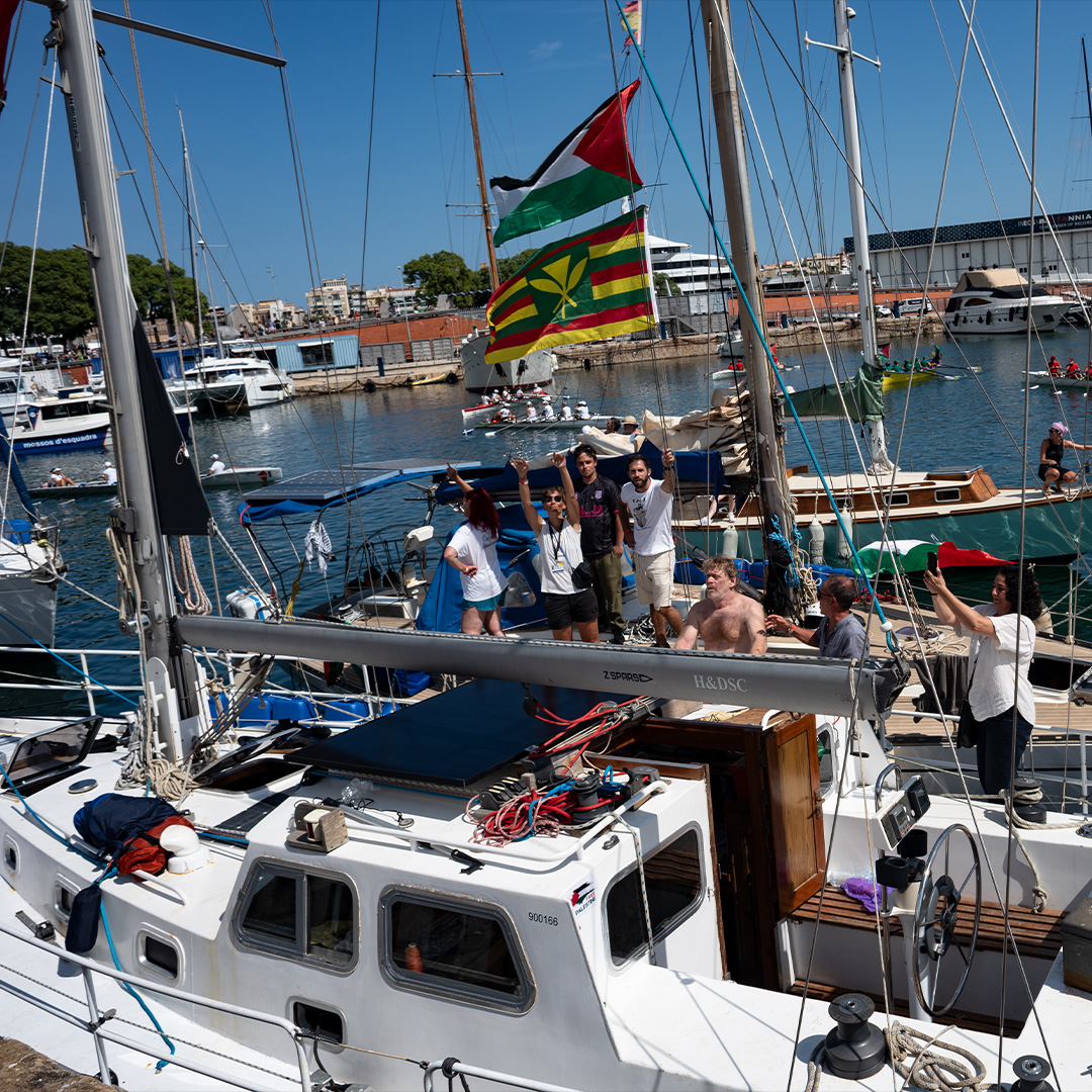 After a night’s storm drenched Tunisia’s coast in heavy rain, and lapped the unpredictable Mediterranean Sea into a flurry of swells, the sun finally peaked through the broken clouds, rays shown down along a fleet of over 50 ships moored in a port in Tunis. The ships are collectively known as the Global Sumud Flotilla. They carry a cargo of food and humanitarian aid, and a crew of activists and volunteers from 44 countries who are making a daring attempt to try and break Israel’s siege of Gaza, and deliver the aid to the starving, desperate population still surviving in the smoldering ruins of Gaza.