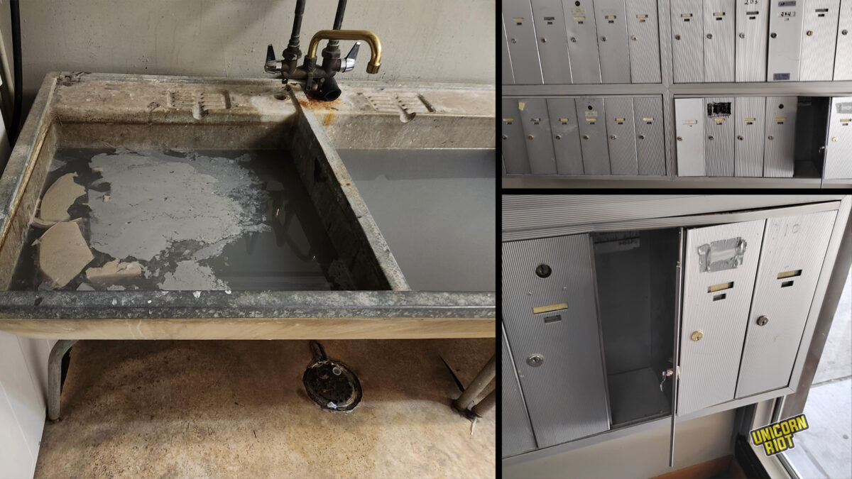 Mailboxes remain open and unsecured. A laundry room has a sink clogged with moldy water.