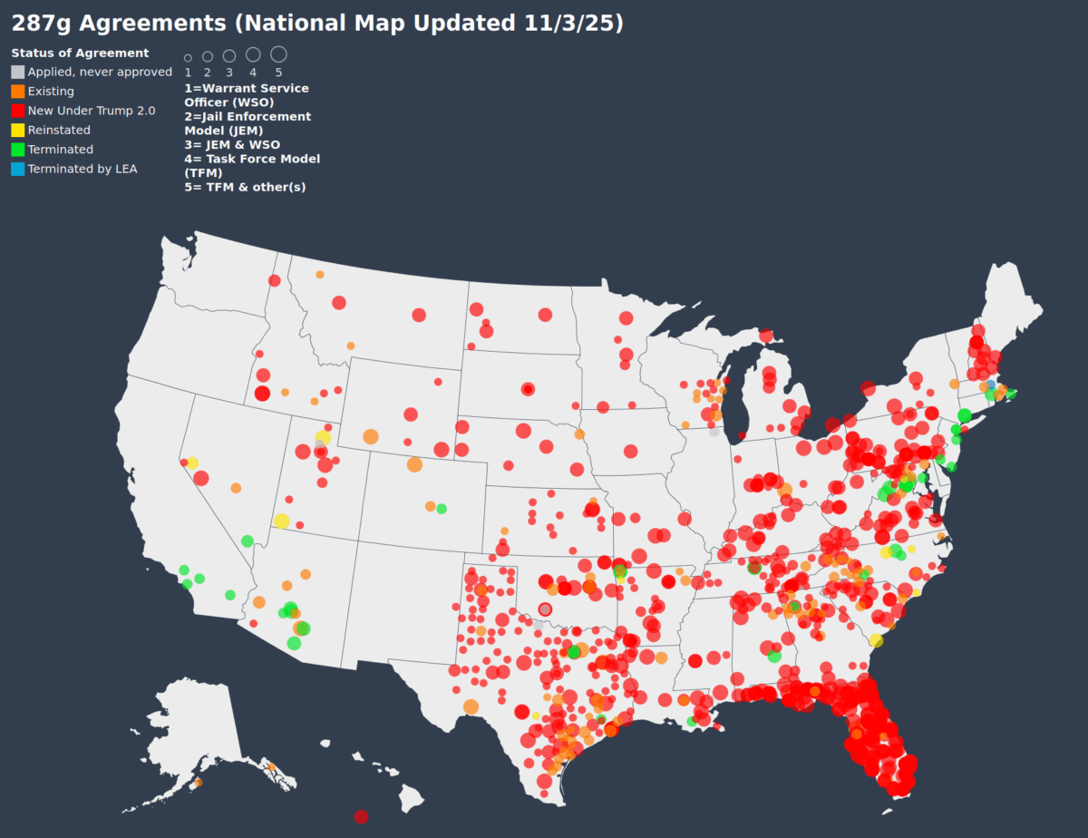 On Monday, November 10, several immigrant rights advocacy groups in Minnesota held a news conference asking people to document federal agents and criticizing the 287(g) agreements. A recent report by State Court Report highlights that state courts are starting to look more carefully at the legal framework of these agreements, since these detainments are effectively new arrests, which might exceed what state law enforcement is permitted to do by their legislatures. (It also mentions a 2019 case in Minnesota, Rodrigo Esparza et al., vs. Nobles County, et al. According to the Minnesota Court of Appeals, the Department of Homeland Security was paying Nobles County “$89.69 per day for each detainee.”)