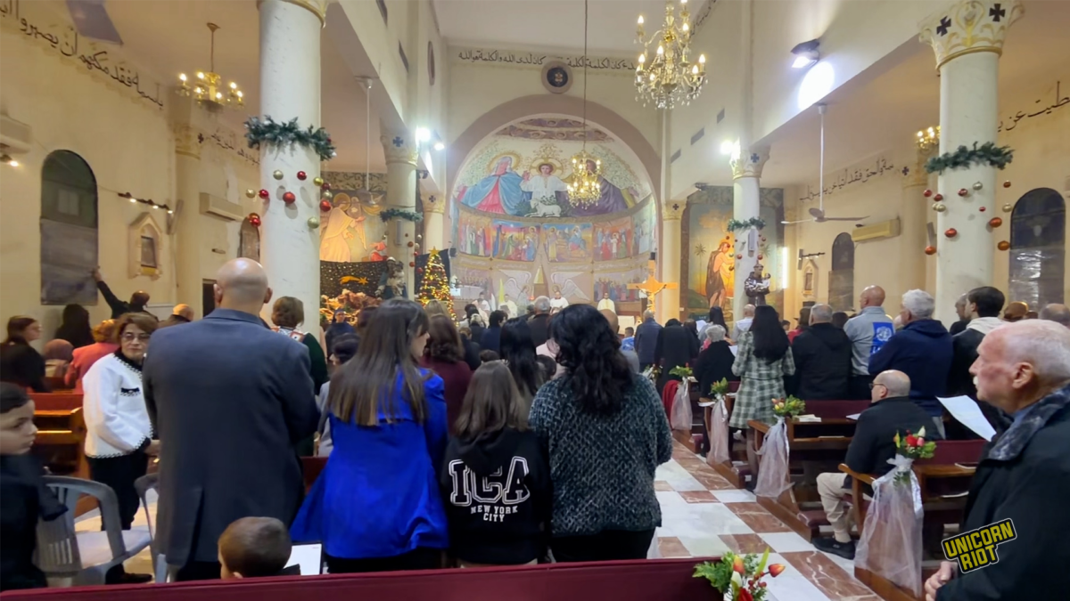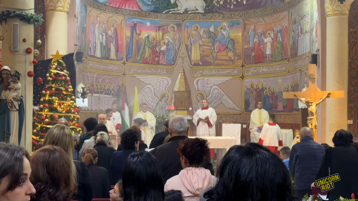 Gaza City, Palestine — Palestinian Christians at Gaza City’s Holy Family Church lit their Christmas tree for the first time since Israel’s genocidal war on Gaza. The ancient church nestled in the Old City neighborhood of Gaza City and still standing after numerous Israeli attacks was decorated for the celebration of the birth of Jesus. Unicorn Riot heard from two young attendees of the services who shared that they were thankful to be able to be alive to celebrate.