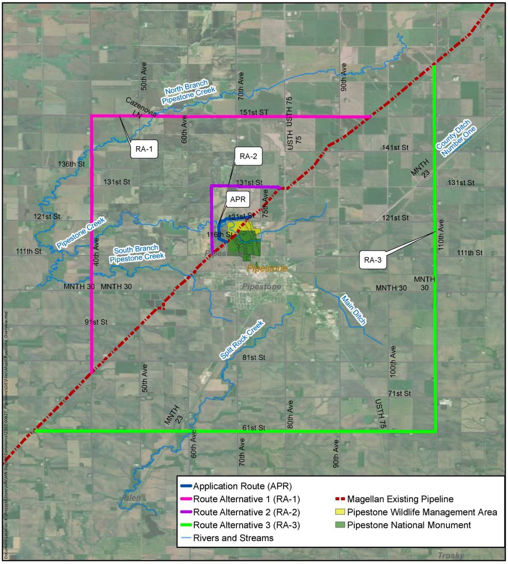 The new permit process now requires Magellan to conduct full cultural, archaeological, and historical surveys for routes RA-01 and RA-03, excluding RA-02, the 3.4 mile-long route proposed by the Magellan Pipeline that is closest to Pipestone National Monument.