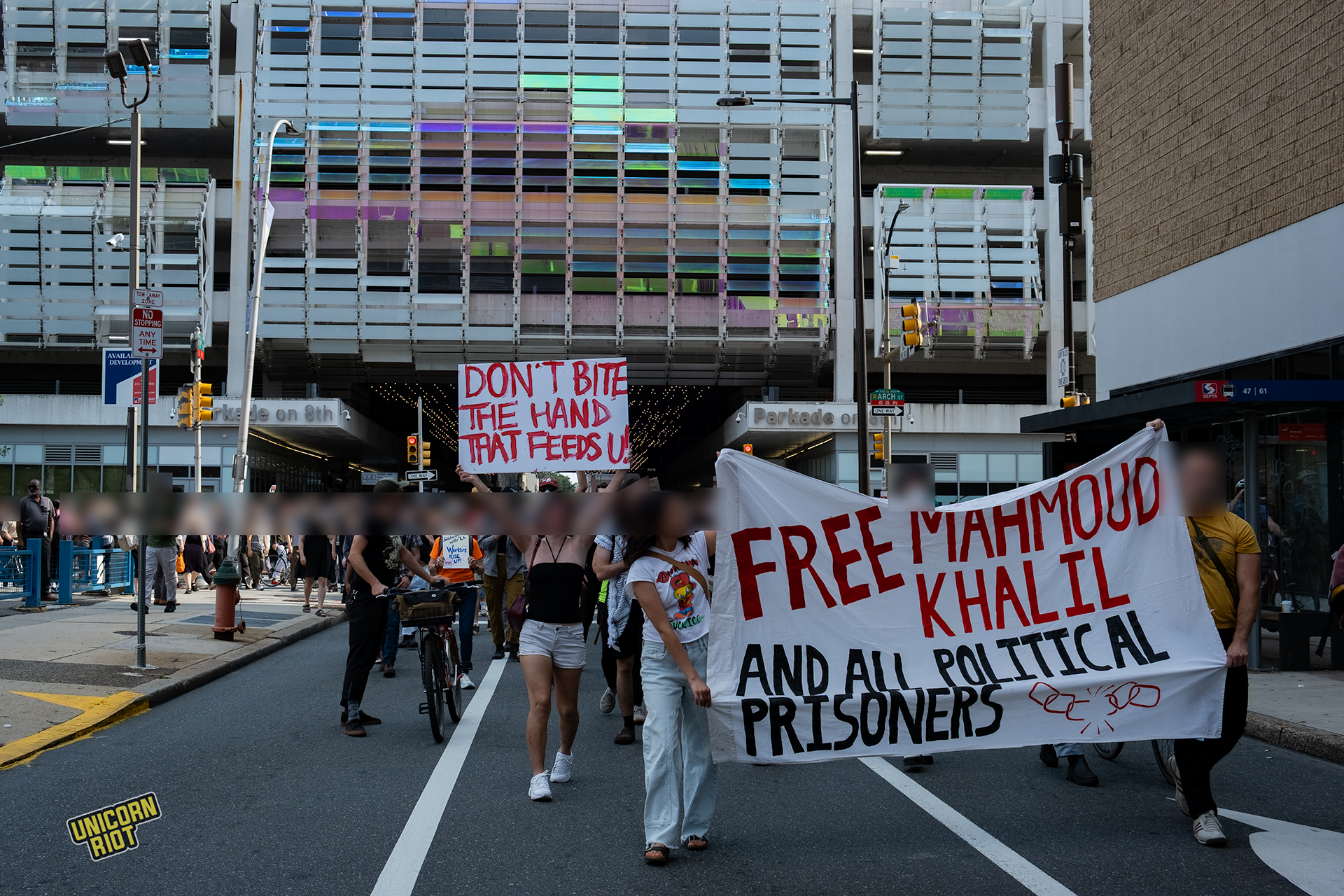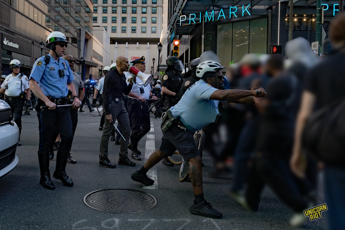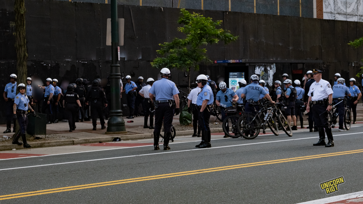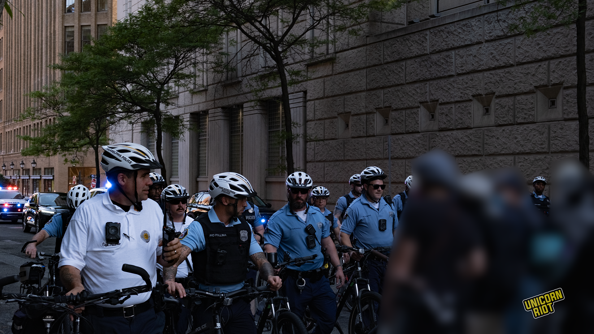 A march then began, trekking past the ICE field office and then down Market Street, taking the prominent throughway. At the end of the second lap, police began pressuring the protest and at 6:44 p.m., issued a order to disperse. The Philadelphia Police Department (PPD) then flanked the crowd in an attempted kettle, struck several people with batons and arrested 15.