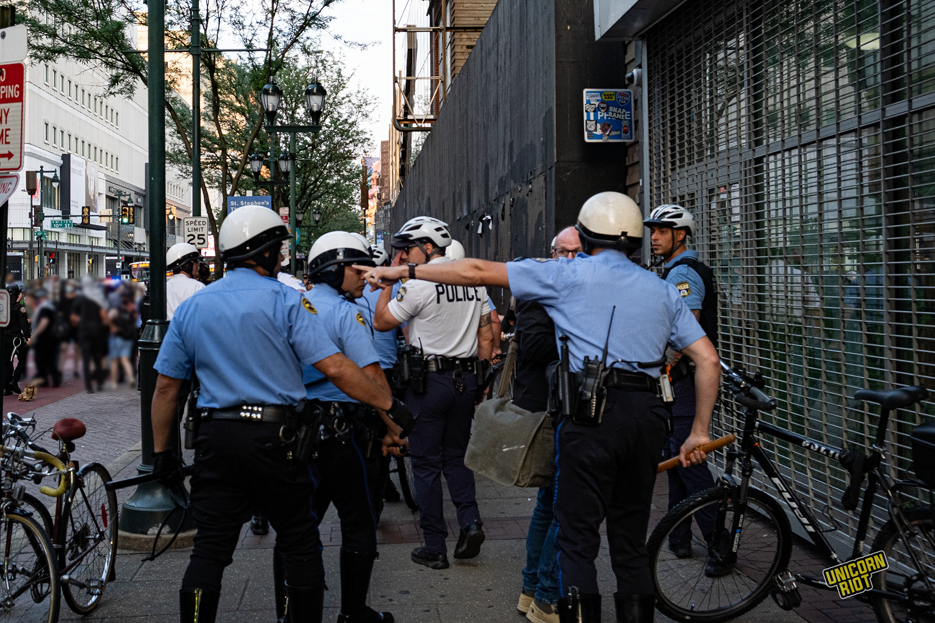 At 13th and Walnut, at about 7 p.m., after the conflict over barricades, police attacked the crowd and kettled it at the intersection. Some protesters then ran through the Holiday Inn Express garage. Police with bicycles lined up to cut off garage access, splitting the crowd. PPD ordered people to leave while they had everyone surrounded, and eventually let some march away while issuing dispersal orders.