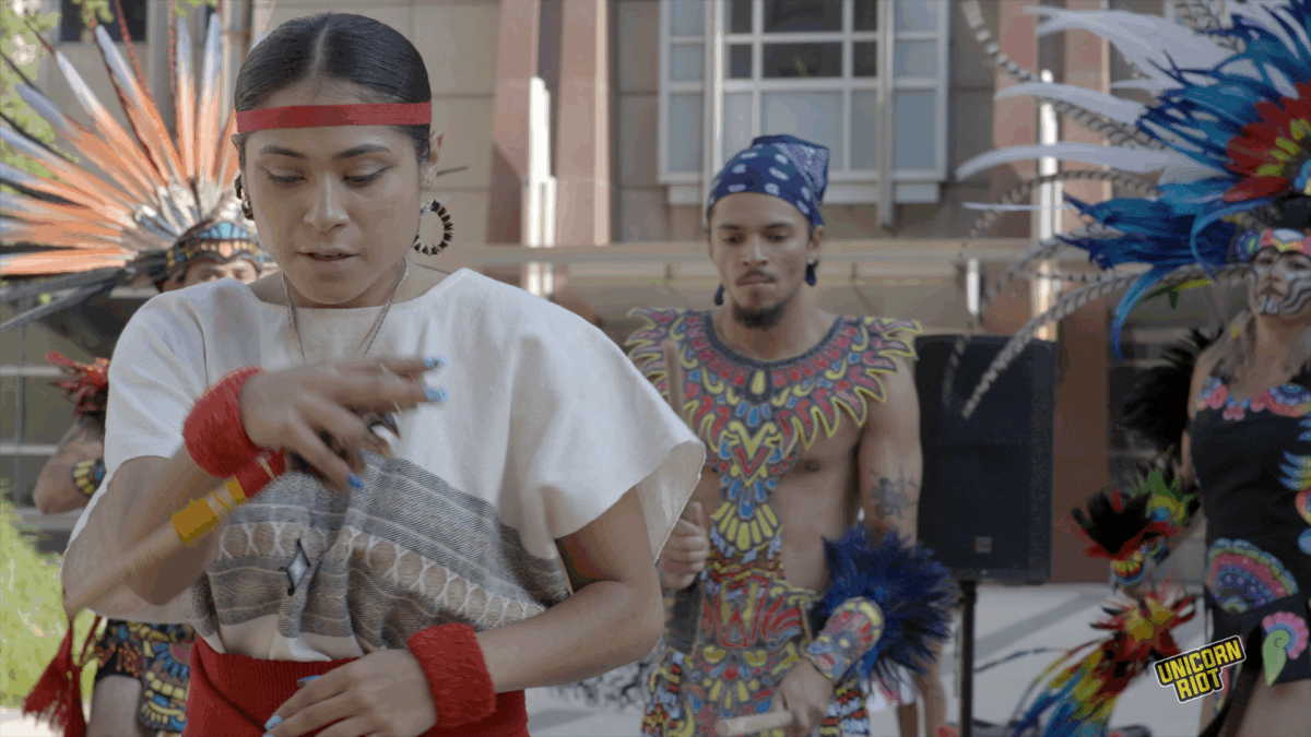 Isa Lopez dances with Kalpulli Yaocenoxtli during rally in front of the federal courthouse in Minneapolis in late September 2025.