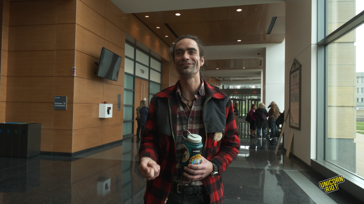 Early that Thursday morning, advocates gathered outside the meeting room, holding signs demonstrating their support for wild rice, as legislators arrived for the Senate Environment, Climate & Legacy Committee meeting. Activist Eoin Small, from Rise and Repair, was hosting this event, providing donuts and coffee.