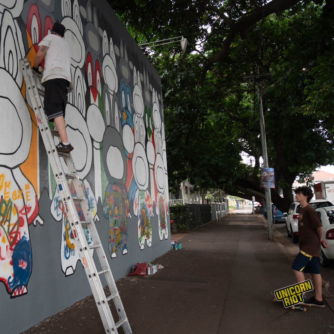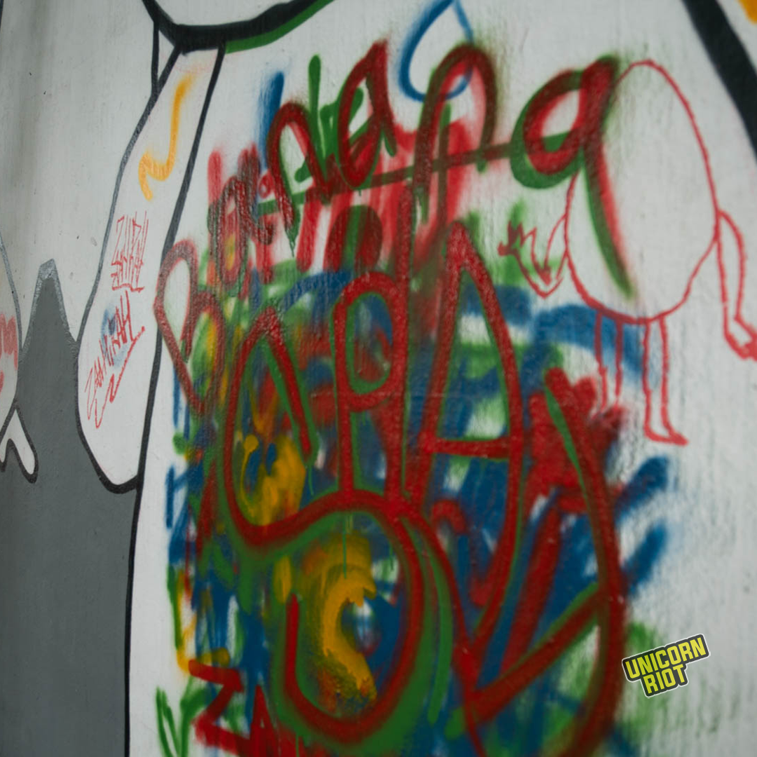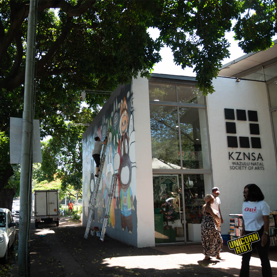 Durban, South Africa — Longtime South African graffiti artist “Ewok” recently showcased his latest mural at Durban’s iconic KwaZulu-Natal Society of the Arts (KZNSA). Unicorn Riot interviewed Ewok during the painting to expound more on the background and inspiration for the anti-consumerist set piece.