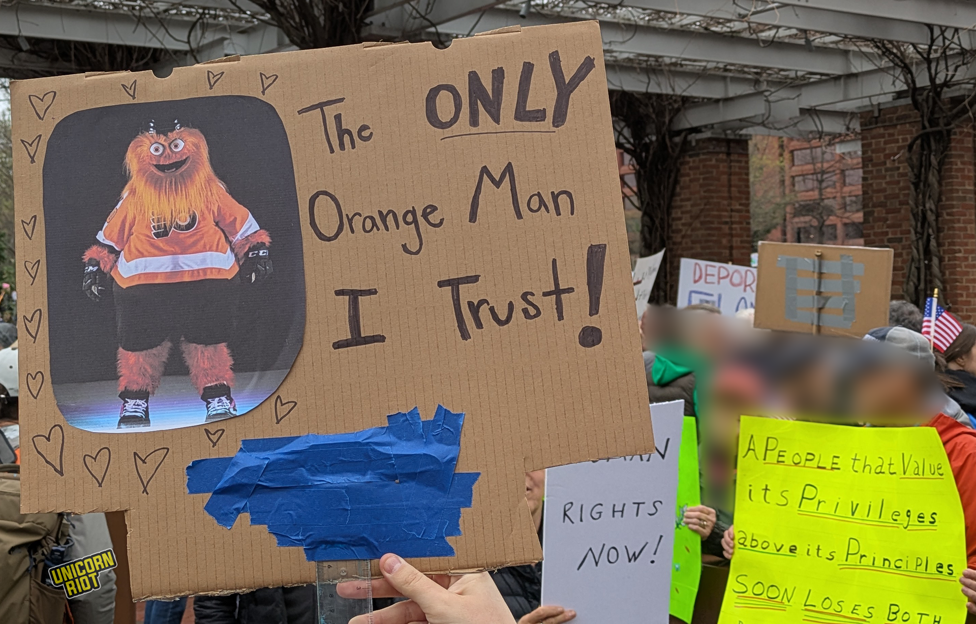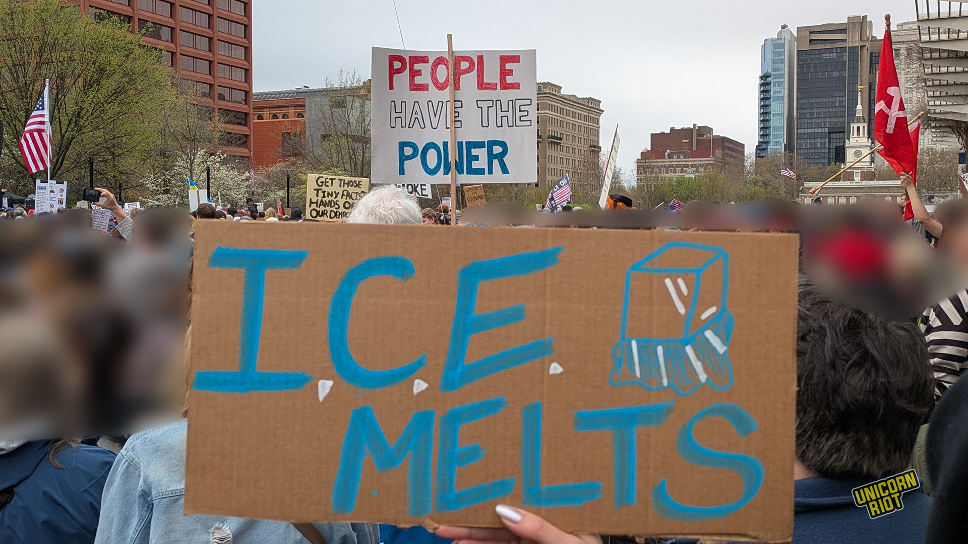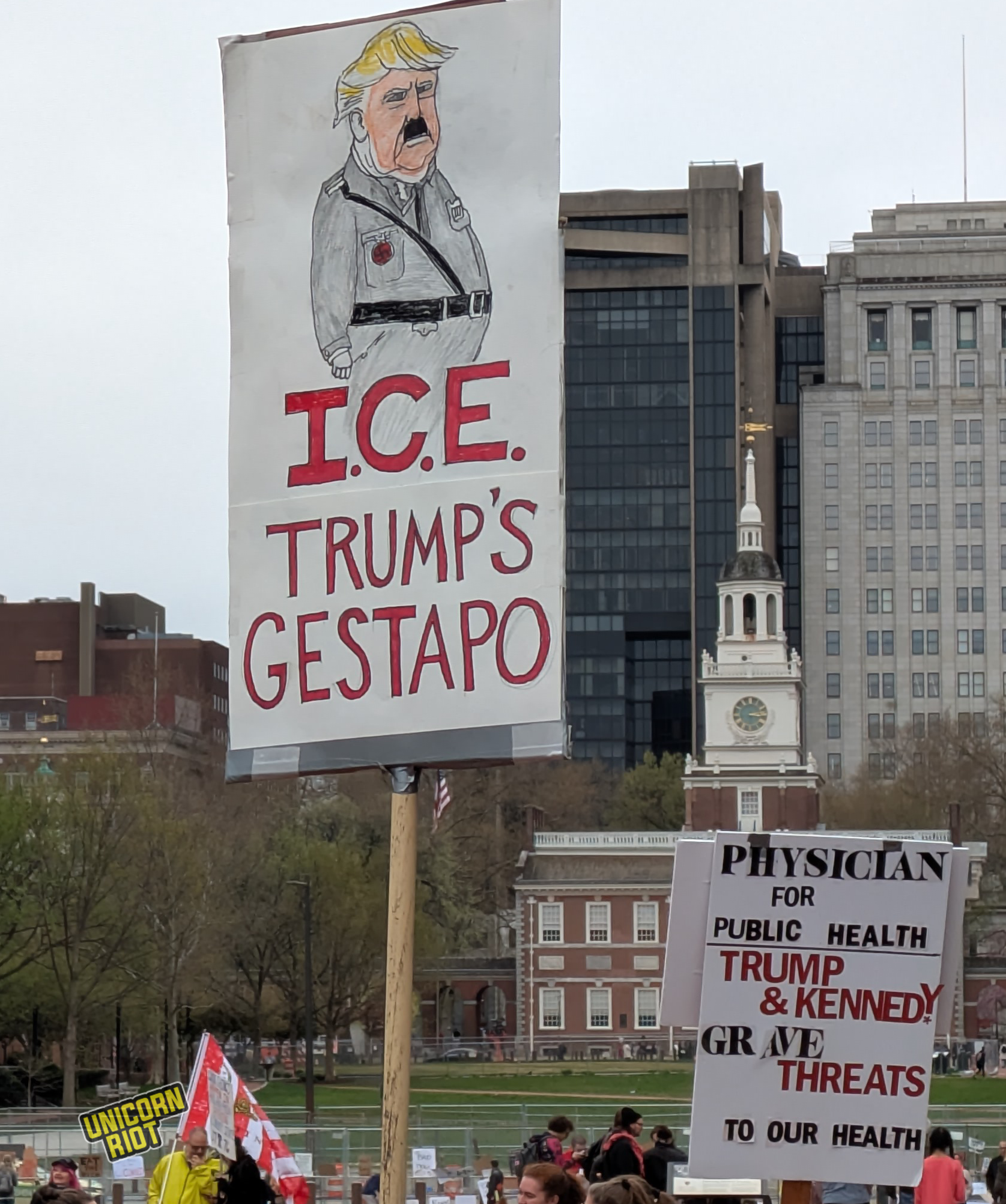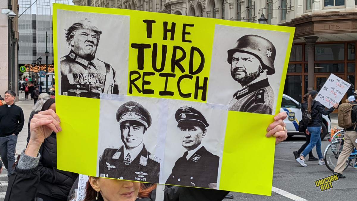 One writer noticed that American newspapers didn’t give as much front-page coverage to the protests as overseas publications. While there has been some online debate about how to process this kind of political activity in relation to the American left as a whole, on the ground in Oakland for example, leftist organizers treated the event as a “recruitment opportunity.” Likewise on the lawn in Philadelphia Unicorn Riot saw tabling and literature distribution by one or two op communist groups without any problems or friction with rally organizers, at least within our sight.