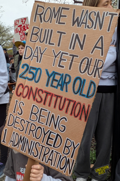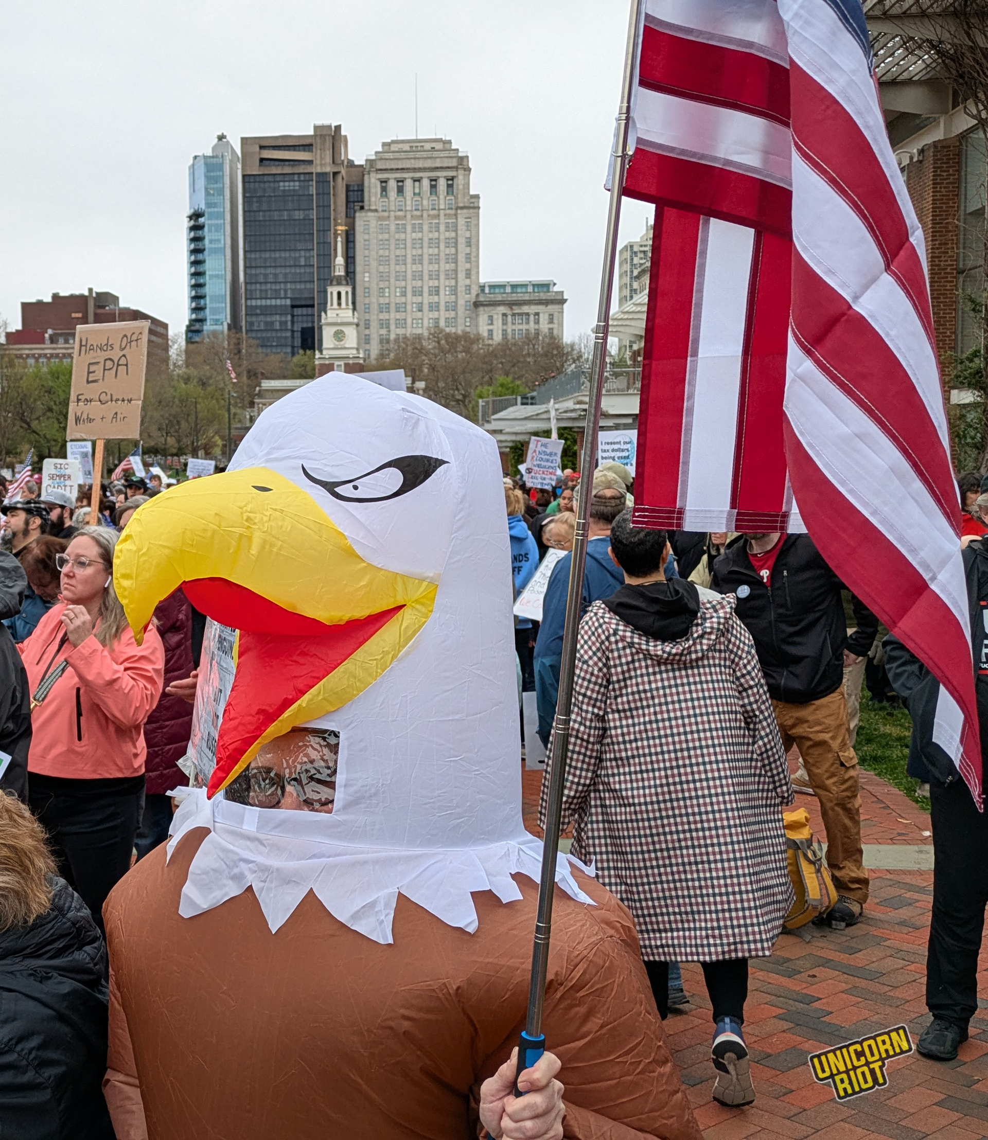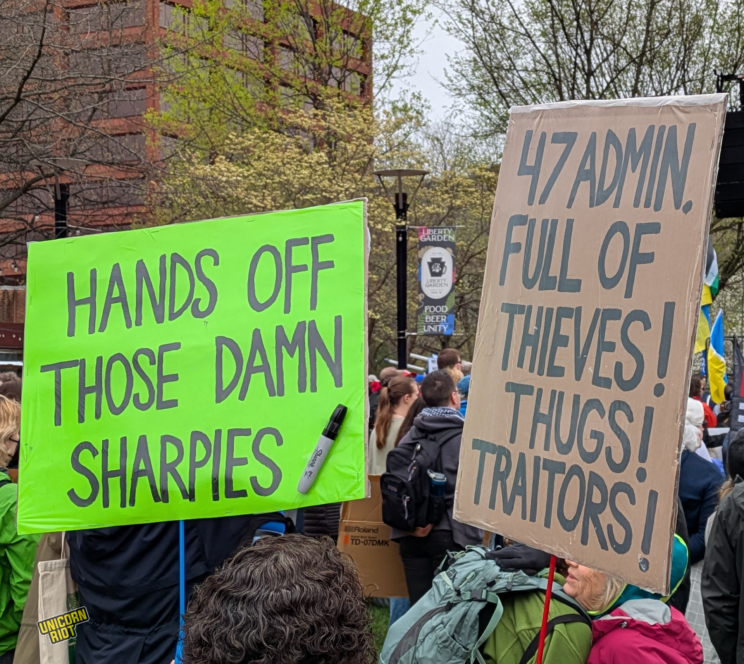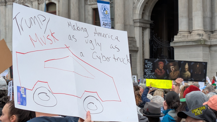 Philadelphia, PA — After a brutal stock market correction and new anti-trade tariff policies, more than 120,000 layoffs of federal workers, dozens of executive orders, and hundreds of immigrant arrests led by ICE, many Americans are reeling from political and financial upheaval caused by the Trump administration. Around 150 liberal groups, including unions, climate and advocacy groups like MoveOn, called for a wide set of #HandsOff rallies around the country on Saturday, April 5. The Philadelphia rally, one of several in the region, gathered at City Hall in Center City and marched down Market Street to the lawn near the National Constitution Center and Independence Hall for a series of speeches from politicians and people who’ve worked at institutions under threat like the Environmental Protection Agency and US Postal Service.