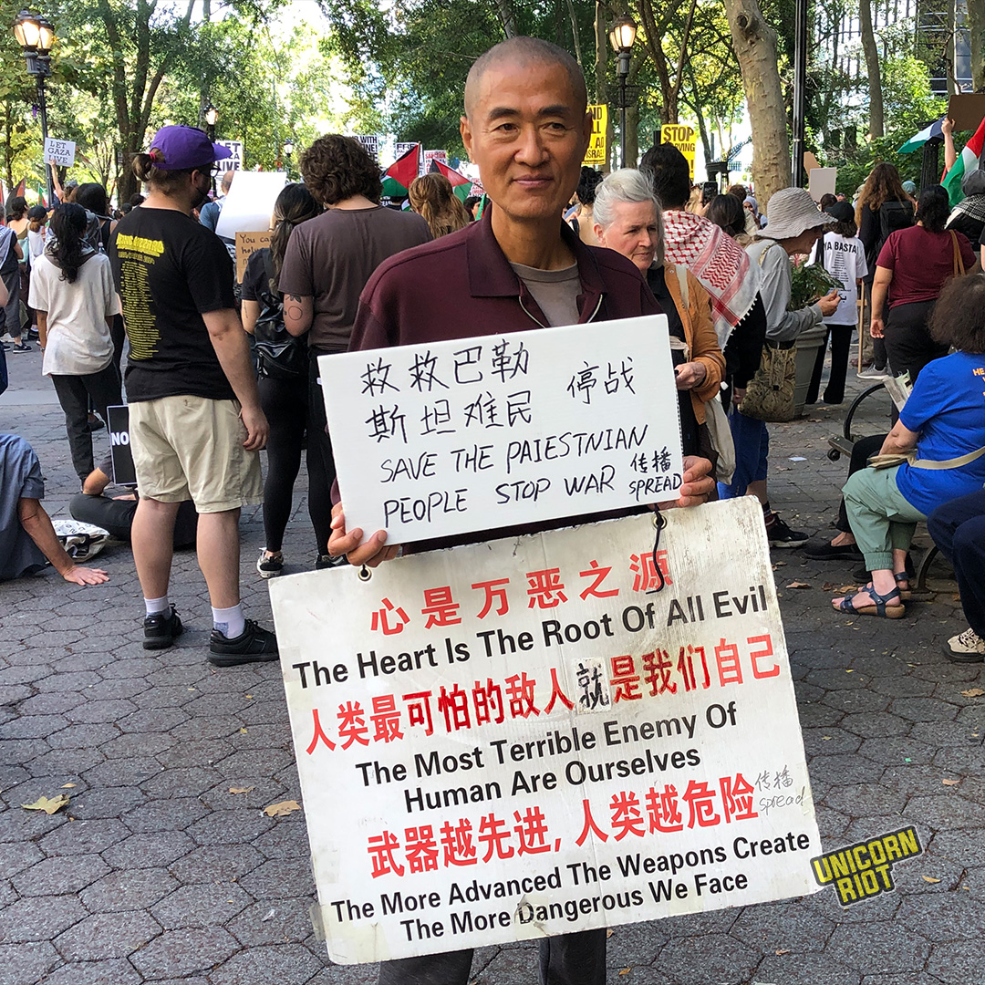 “Just now at the UN, the criminal Benjamin Netanyahu took the stage. And the representatives of almost every nation on Earth walked out,” Ju-Hyun said to the cheering crowd. “There is not a shred of authority in that godforsaken building so long as these blood killers walk amongst them. The only authority is here. The only authority is with you,” they shouted into the microphone.