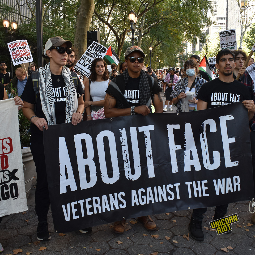 One supporter of Colombia’s plan was Thom Keppen, a US veteran who fought in Afghanistan. Now, he organizes with About Face Veterans Against the War. A dozen veterans stood beside him, some dressed in their military uniforms as he spoke. “We are here today because, as post 9/11 veterans, we witnessed the devastation that the US war machine released on Iraq and Afghanistan. And we see the same systems in place now in Gaza,” he said.