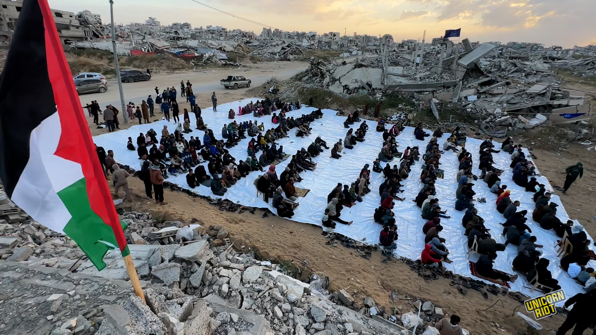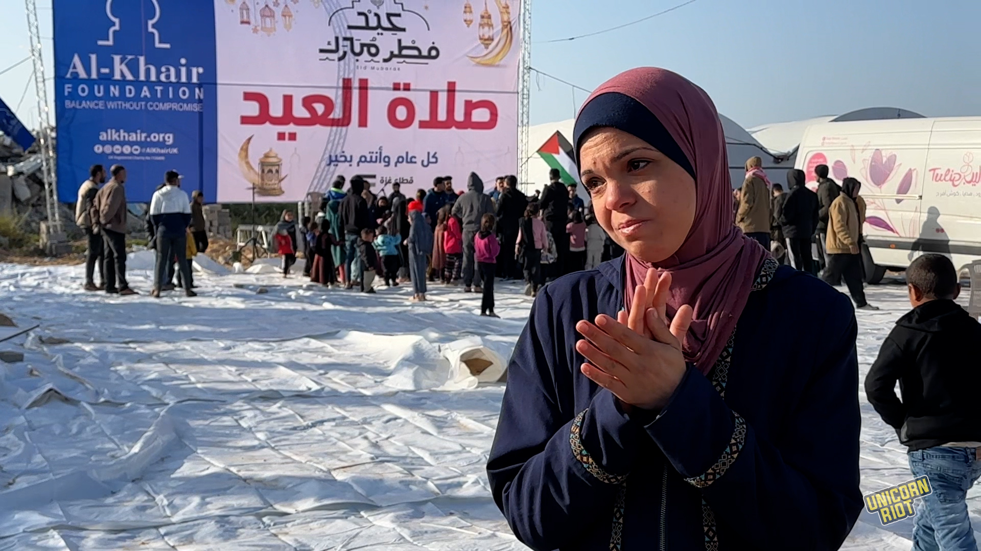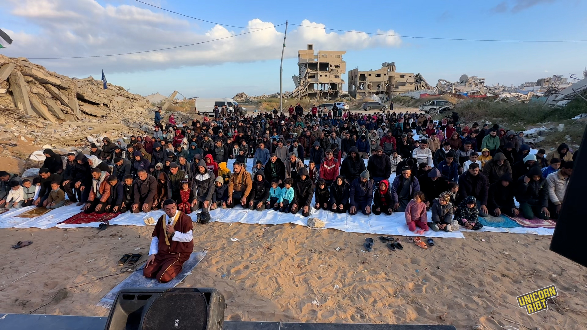 “We, the displaced, scattered, homeless in these devastated and desolate places which emerged after war and widespread destruction, have come here to celebrate with the Eid prayer to revive what little hope and longing remains within us,” Abu Ali al-Dahdouh told Unicorn Riot.