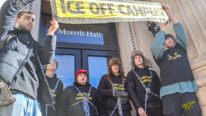UMN students chain themselves to the administrative building to demand a sanctuary campus – In a protest against the university’s accommodation of DHS and ICE, six students chained themselves to Morrill Hall, which houses the campus’s administration and has been the site of large scale protests over the decades, demanding university President Rebecca Cunningham declare the university a sanctuary campus. Three of the chained students left citing the potential for academic retaliation and police arrested the remaining three.