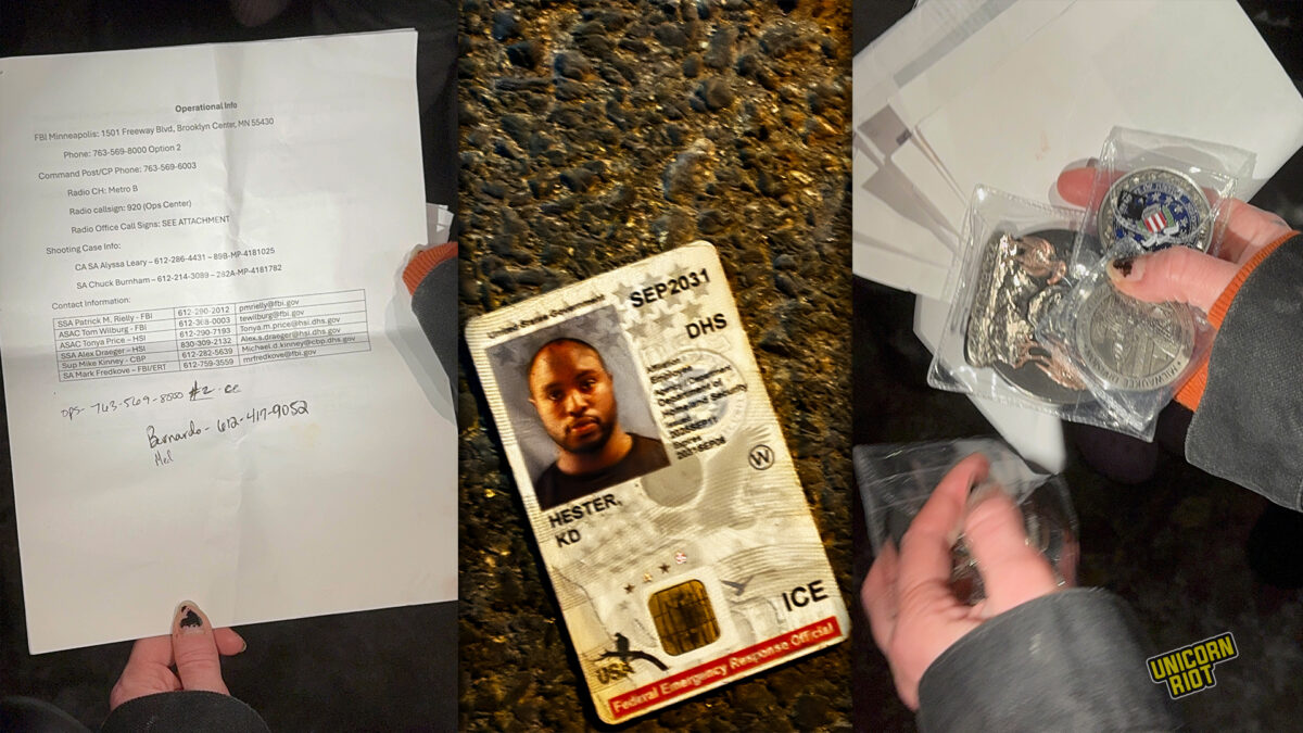 The ICE agents fled the scene on foot, leaving behind two-to-three unmarked patrol vehicles. Protesters damaged the cars, smashing windows, writing graffiti, and flattening tires. Some found documents and materials left behind by the agents using the vehicle that revealed sensitive operational details about ICE’s operations in Minnesota.
