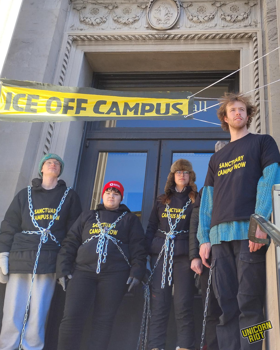 Yesterday, four students chained themselves together on the Morrill Hall steps, calling on the university to cut ties with ICE.