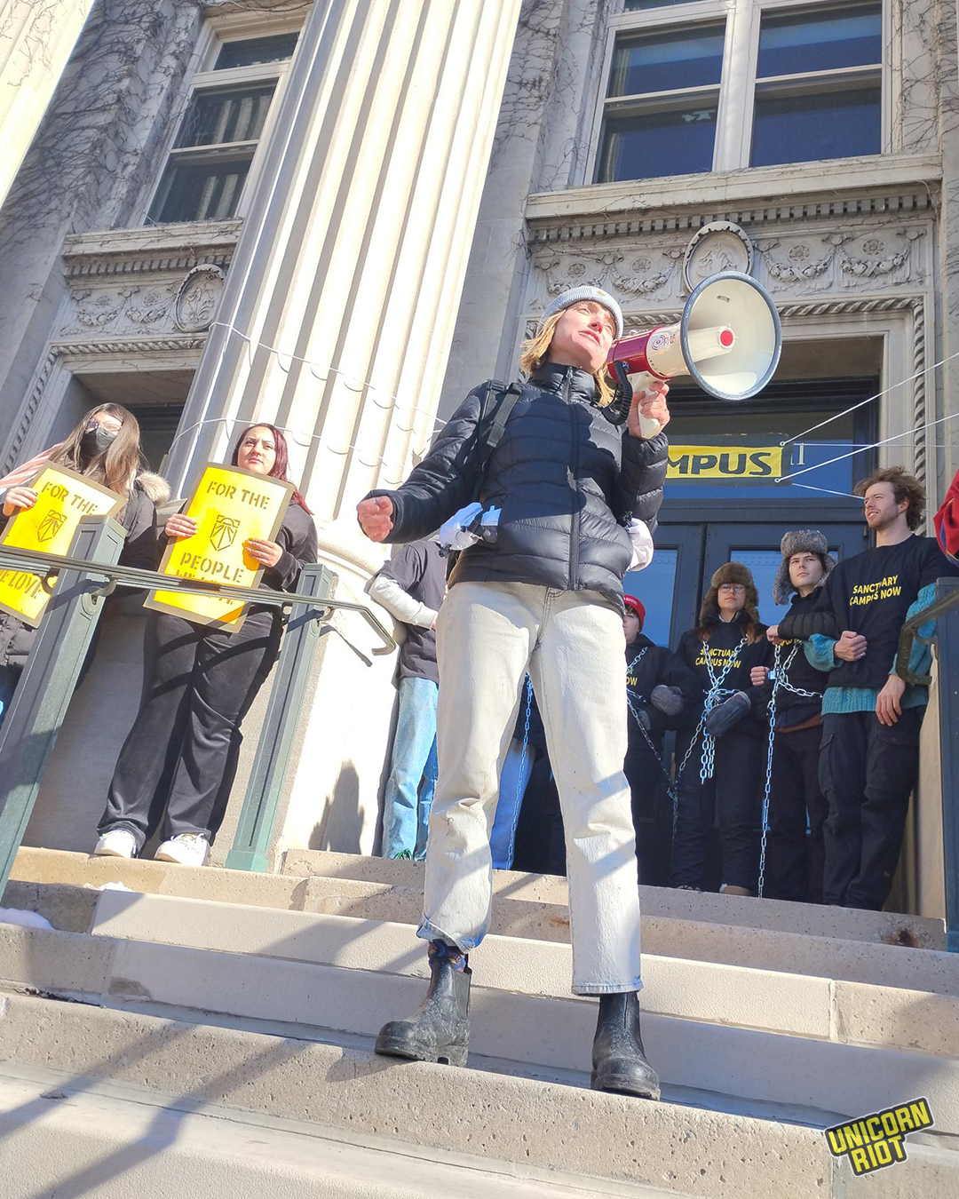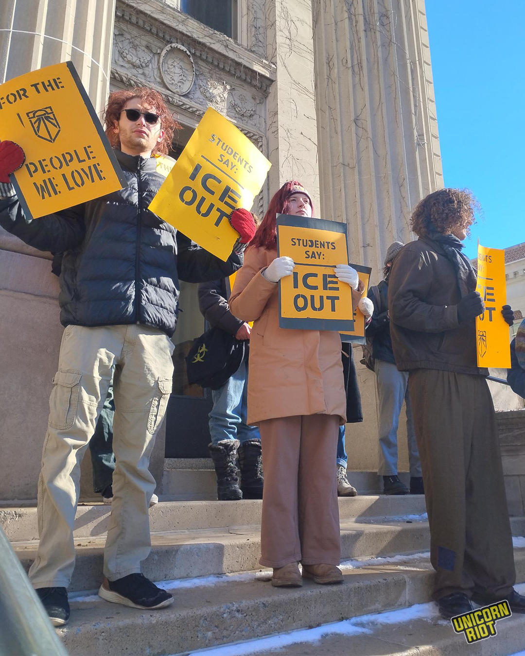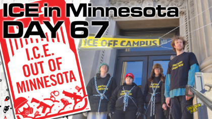 Minneapolis, MN — Six students took the icy steps of Morrill Hall around 1 p.m. on February 6. Four of them chained themselves together, saying they would not leave until they met with University of Minnesota President Rebecca Cunningham. They called on the university to cut ties with Immigration and Customs Enforcement (ICE).