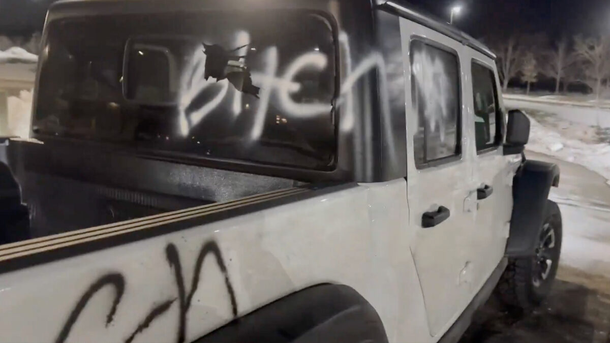 Later that evening, some of the protesters turned on Sortor and Higby in their Jeep as their numbers dwindled. They pounded on the hood, broke the rear window and spray painted the word “bitch” multiple times on it while the two men were still inside of it.