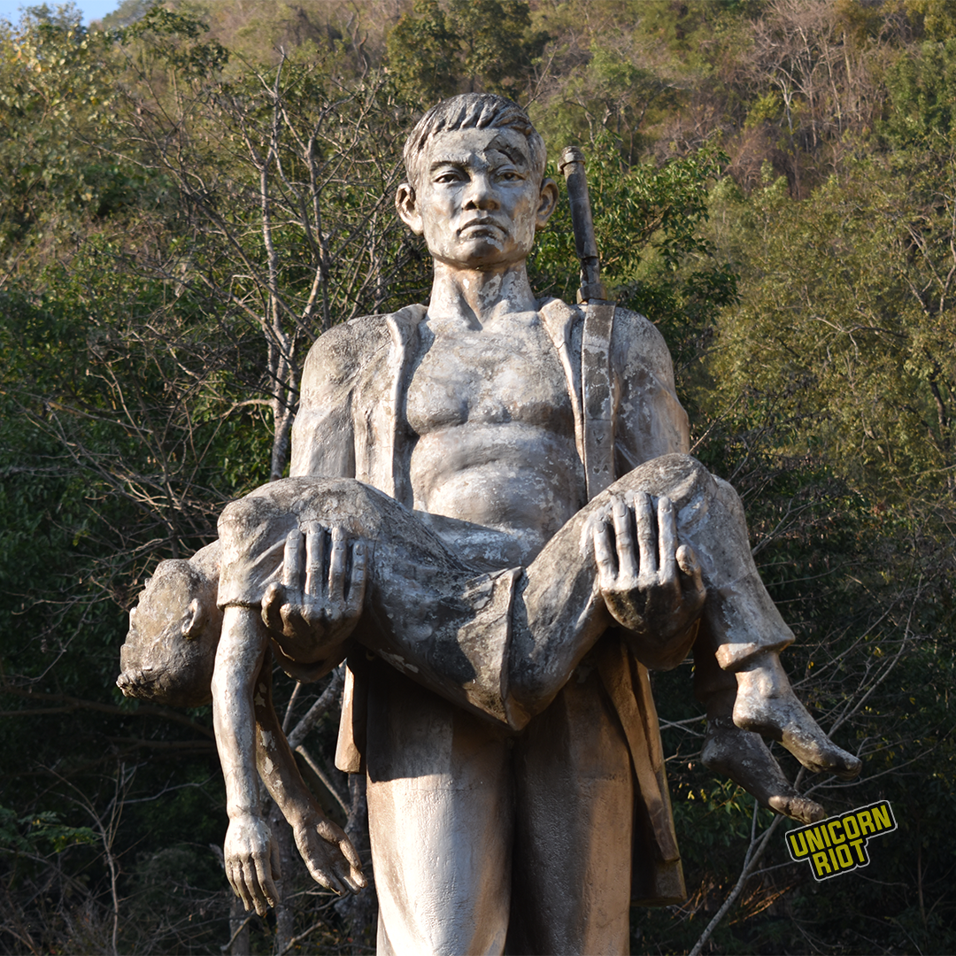 A statue of a man holding a dead child greets visitors at the foot of the mountain where Tham Piew Cave is. The cave served as a refuge for villagers after their homes were destroyed by American bombs. On November 24, 1968 an American jet fired a missile into the cave, killing 374 men, women, and children. Inside the dark cavern is an endless array of stone cairns, and Buddhist and animist offerings to honor the dead.