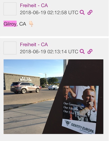 One Identity Evropa postering image ‘freiheit’ shared in June 2018 was from Gilroy, CA, where recently, on Sunday, July 28, 2019 , a gunman shot and killed 3 people at the local Garlic Festival after leaving an Instagram post referencing an anti-semitic text.
