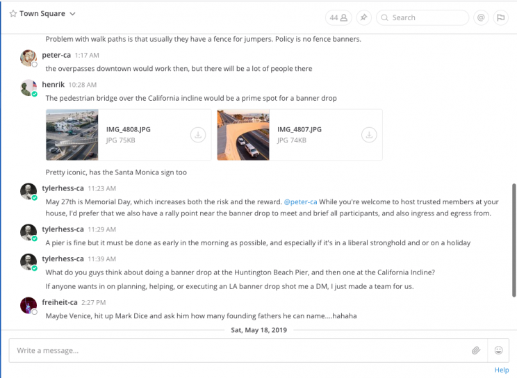 Newly leaked chats, obtained by Unicorn Riot from inside the group’s private web server, shed light on their activities in US states grouped into the ‘Southwest’ regional chapter – including Nevada, Arizona, and (primarily) California. Like the group’s national chats that we leaked in early July, the Southwest chat server runs MatterMost software on a web server hosted by Amazon Web Services.