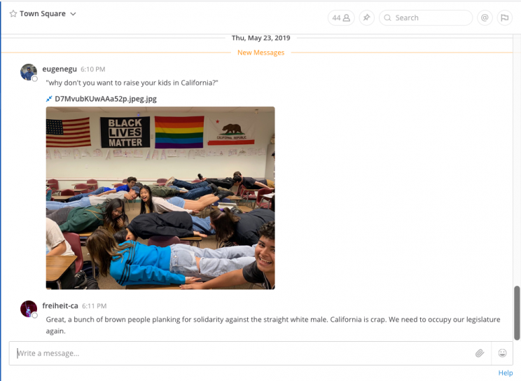One California member of Identity Evropa/American Identity Movement, who uses the handle ‘freiheit’ in leaked Discord, Slack, and MatterMost chats, fantasized about parts of California falling off into the ocean leading to a decrease in “uninvited Mexicans.” ‘Freheit‘, who is apparently one of the most active unidentified members of the group, posted in Identity Evropa’s leaked Discord chat that he is based in San Martin, CA. He also shared many images of Identity Evropa propaganda he placed in locations across California.