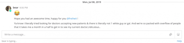 One message Palmer shared in July, that was later deleted by moderators, shows the typical attitude of casual racism among members of the group. ‘bear’ complained that she was unable to find any white doctors and that she was not comfortable receiving medical care from non-whites.