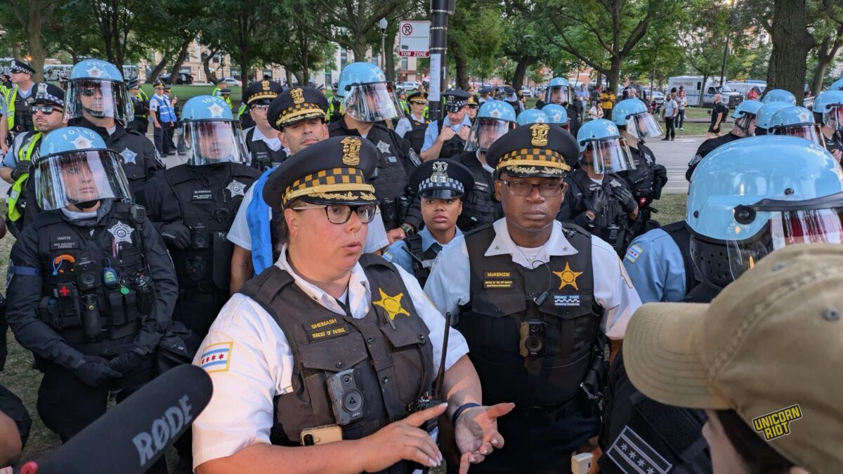 After staging the crowd and taking the street, the crowd of thousands of protesters approached the security perimeter of the United Center, where the first day of the Democratic Convention was getting underway. Some marshals affiliated with the March on the DNC 2024 Coalition attempted to prevent groups of fired-up protesters from directly approaching the DNC security gates; one more militant protester upset at being policed by protest marshals was seen spraying black spray paint onto the marshal’s vests.
