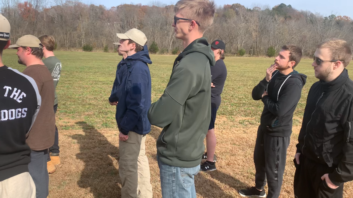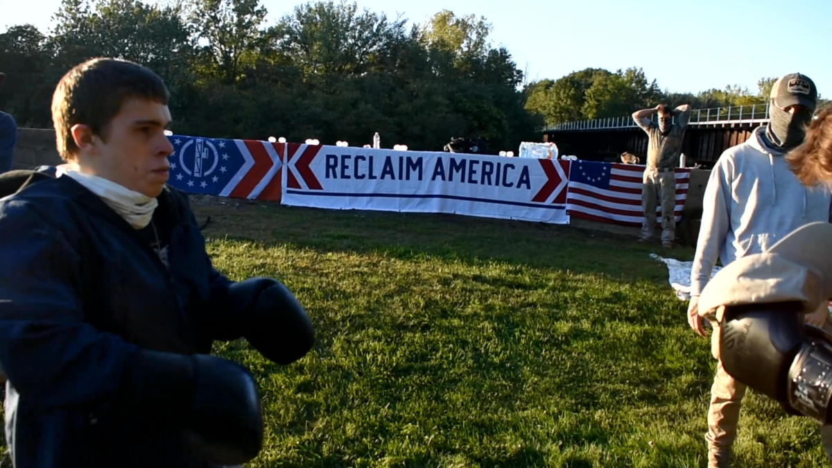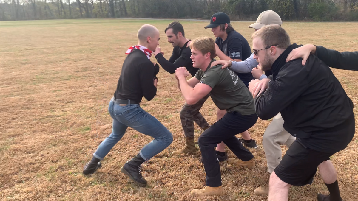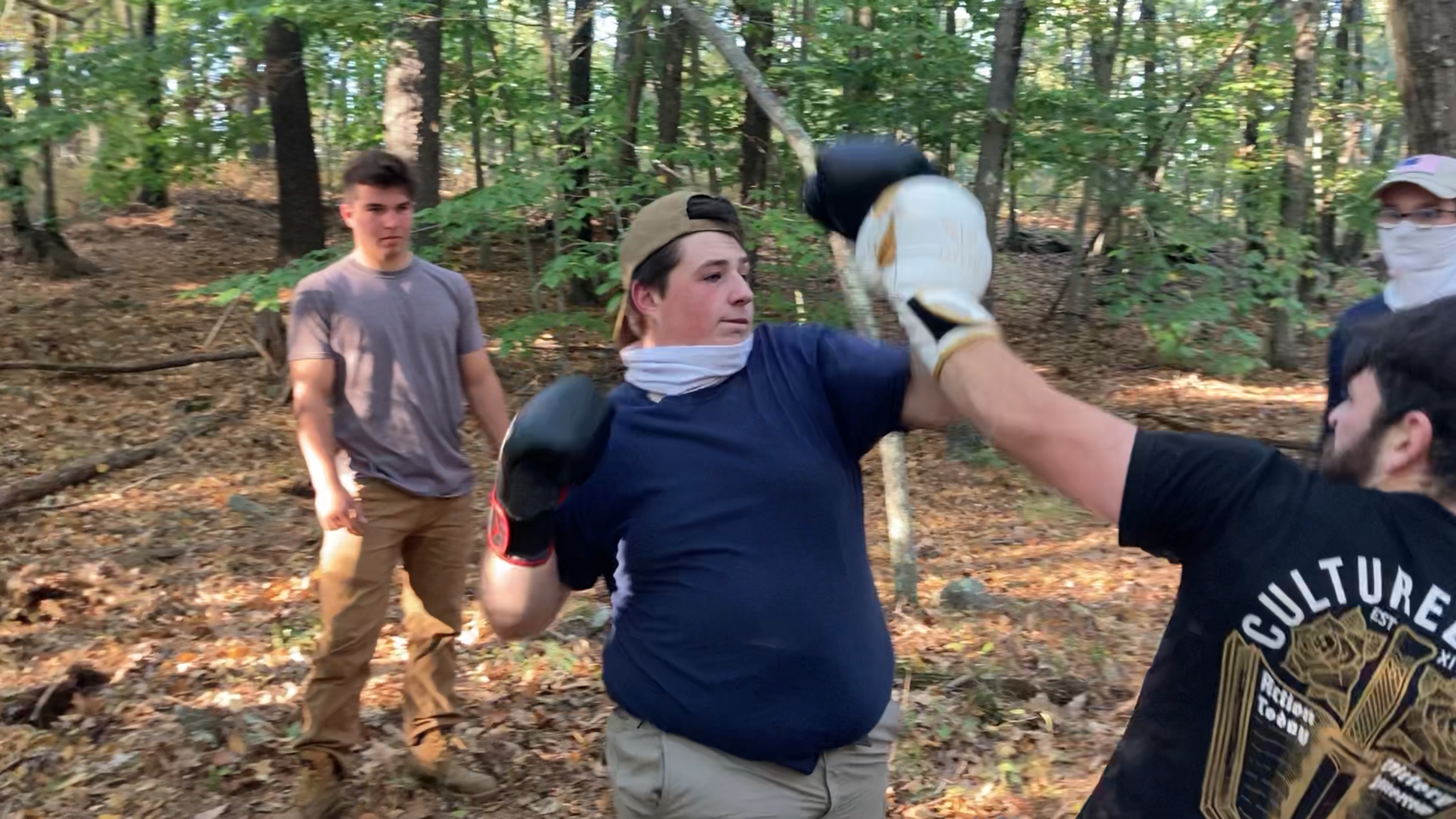 - 2021-11-20_13.17.45.mov shows active drilling with someone playing an ‘agitator’ role for the training group. The person playing that role has a shaved head and boots with white laces, attire commonly associated with the white power ‘bonehead’ (racist skinhead) mileu.