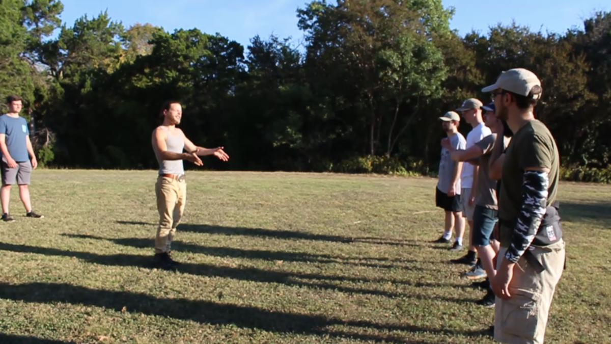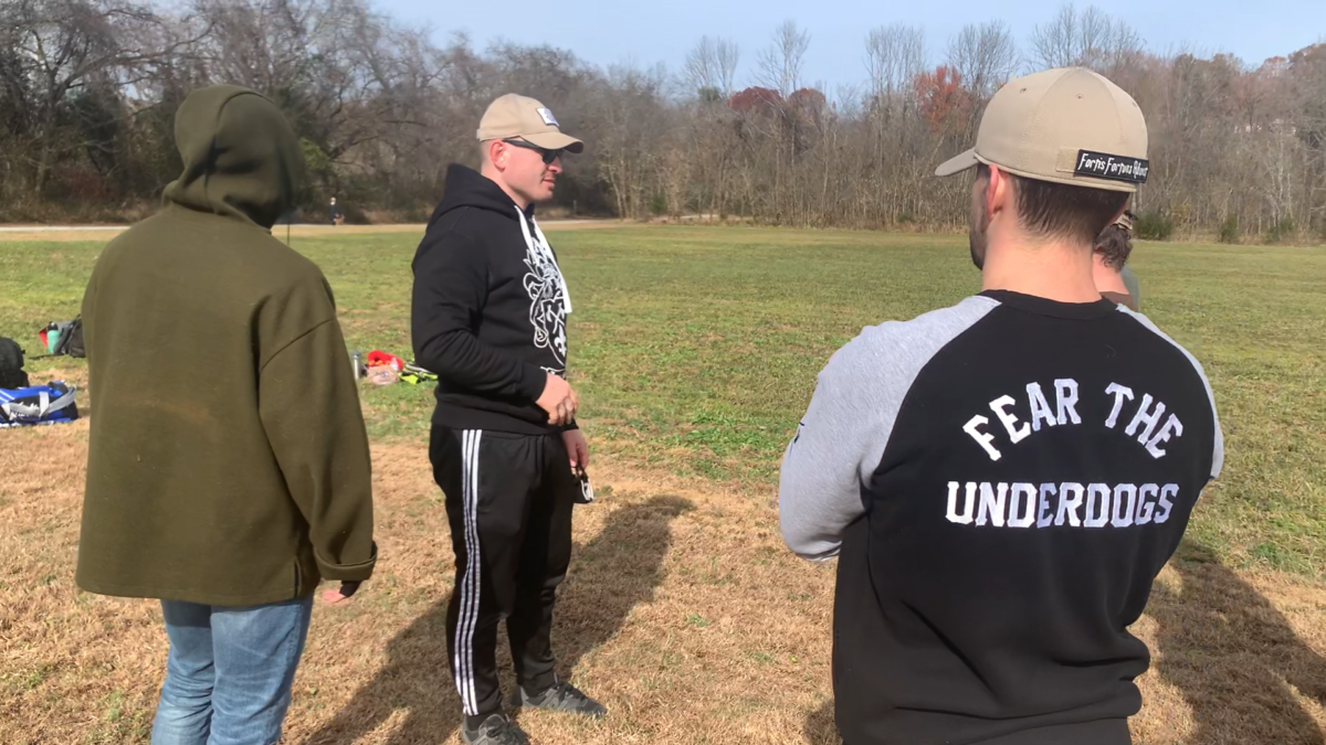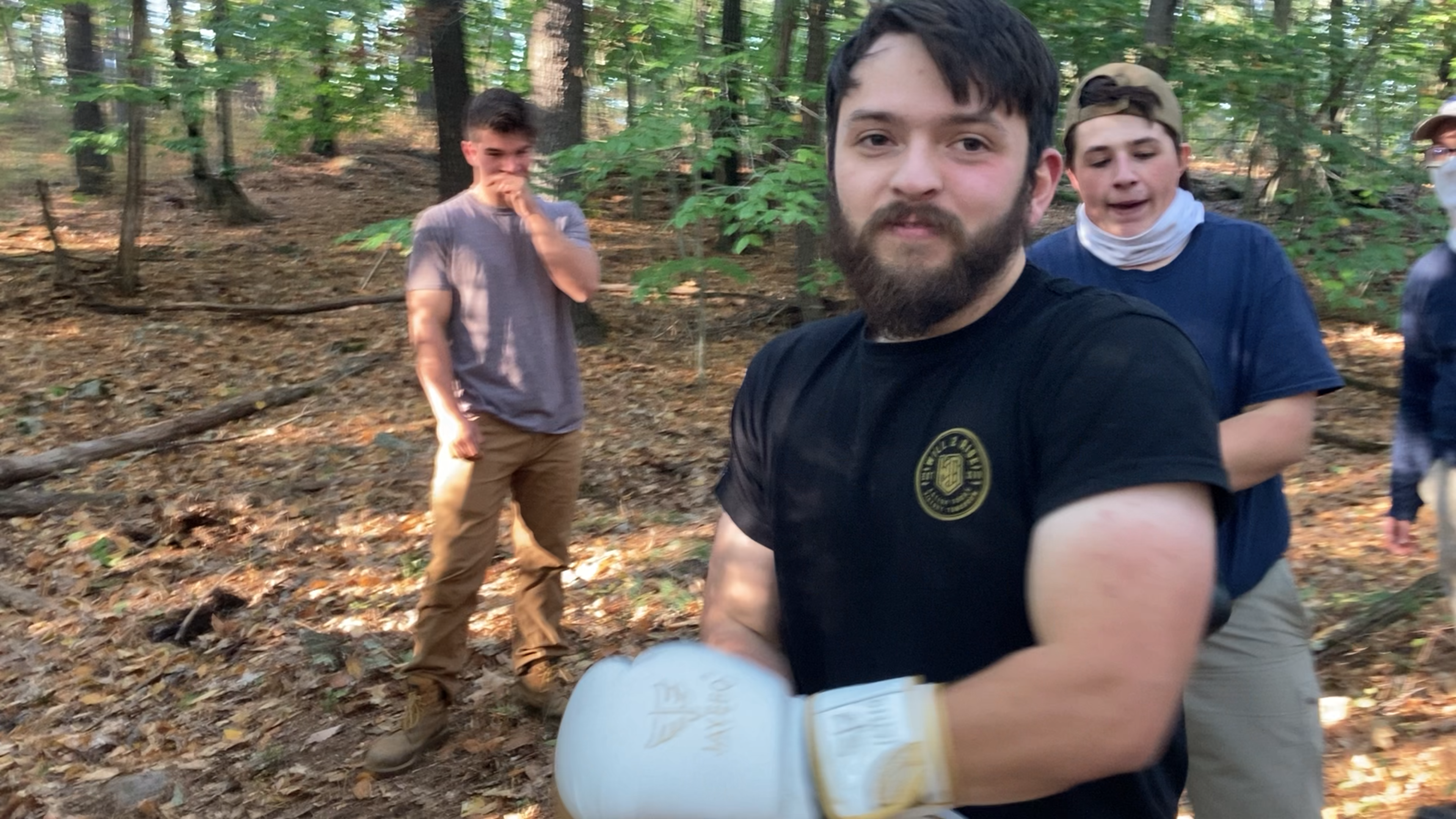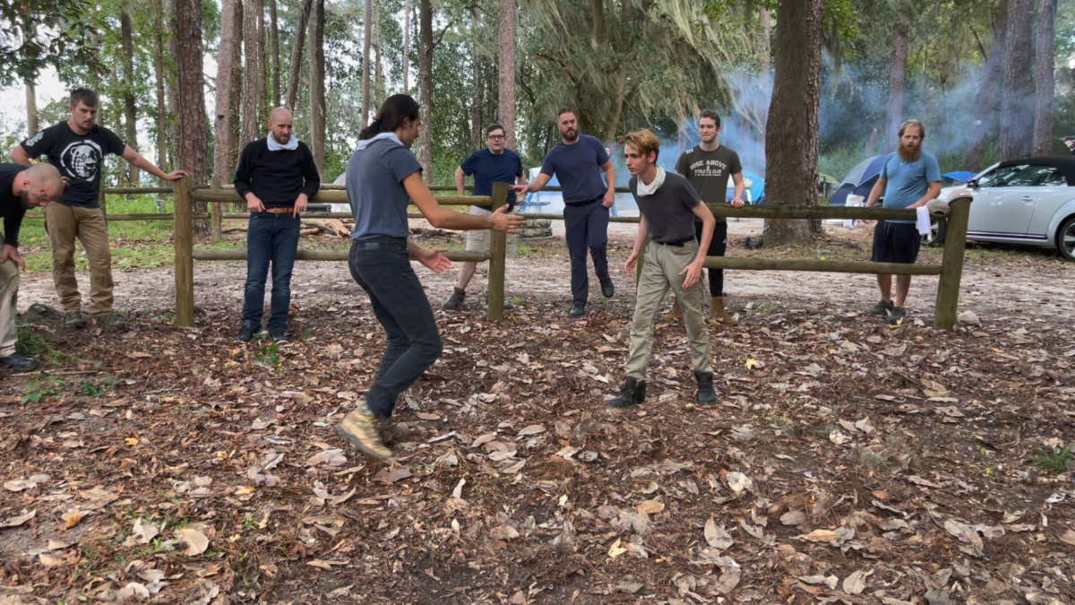 - 2021-11-20_13.17.45.mov shows active drilling with someone playing an ‘agitator’ role for the training group. The person playing that role has a shaved head and boots with white laces, attire commonly associated with the white power ‘bonehead’ (racist skinhead) mileu.