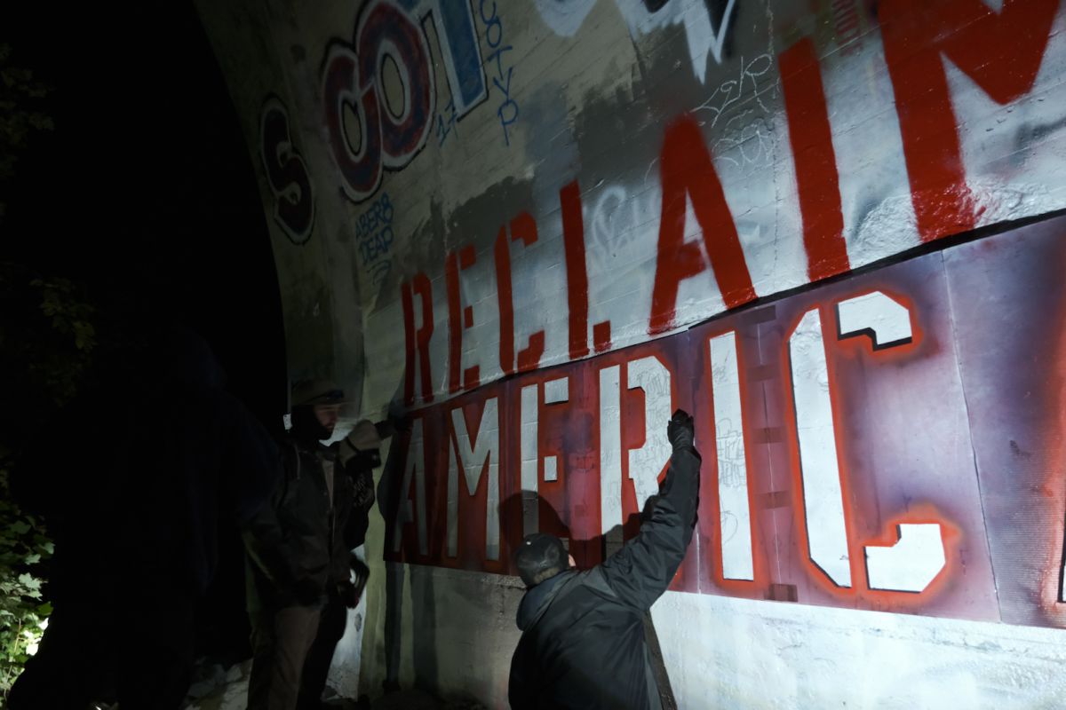 - Summary: Photos and videos show Patriot Front stencils being spray painted under a bridge in the rain. One Patriot Front member applies the stencils while another films.