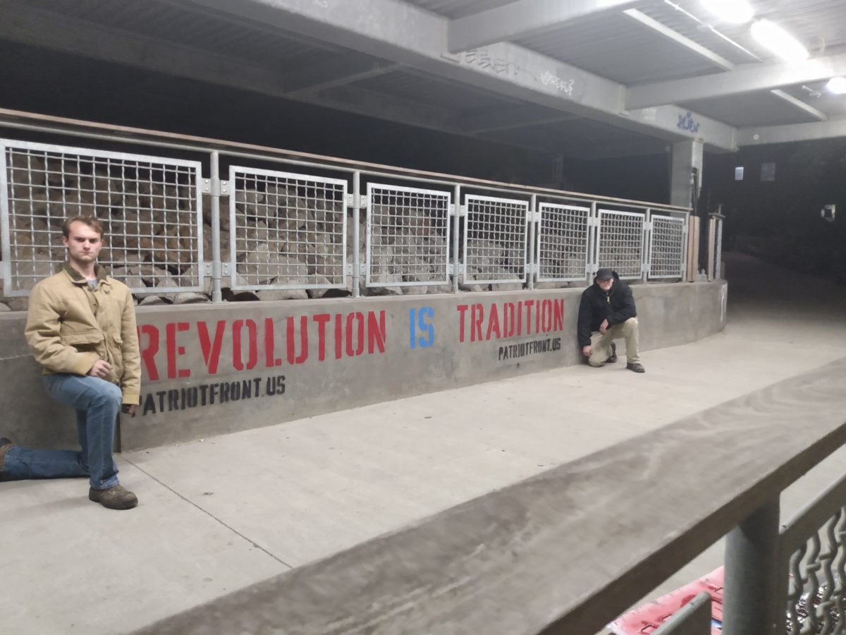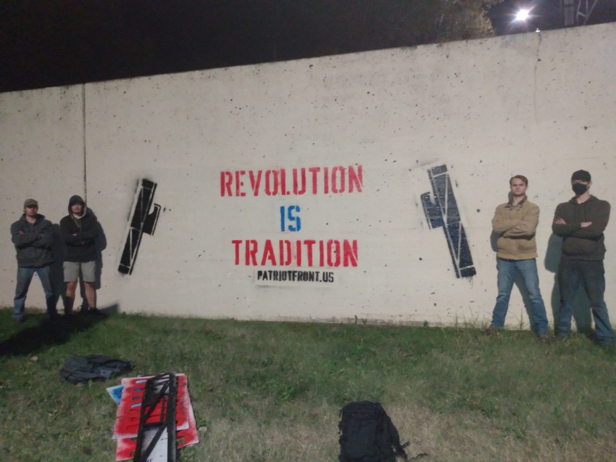- Summary: Photos of 4 masked Patriot Front members in front of a spray painted stencil that says ‘Revolution is Tradition’ with Patriot Front’s website URL and two fasces symbols.