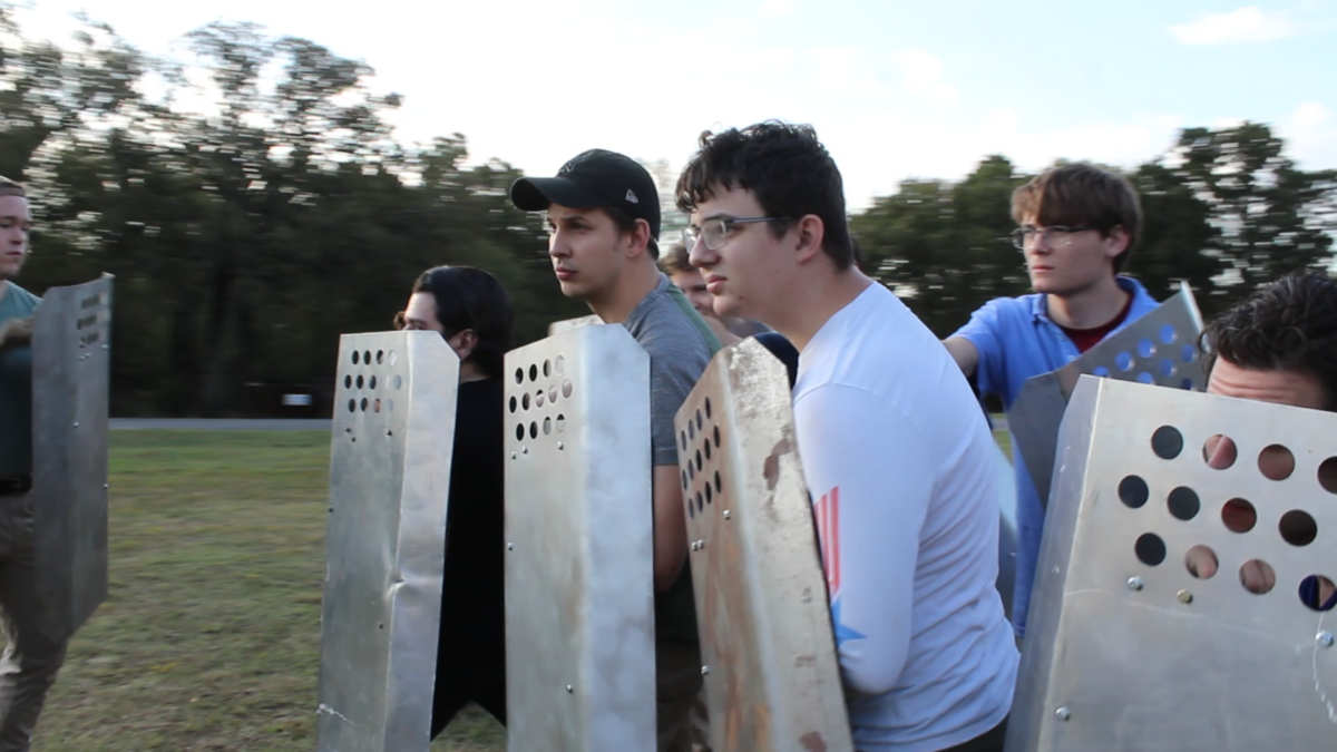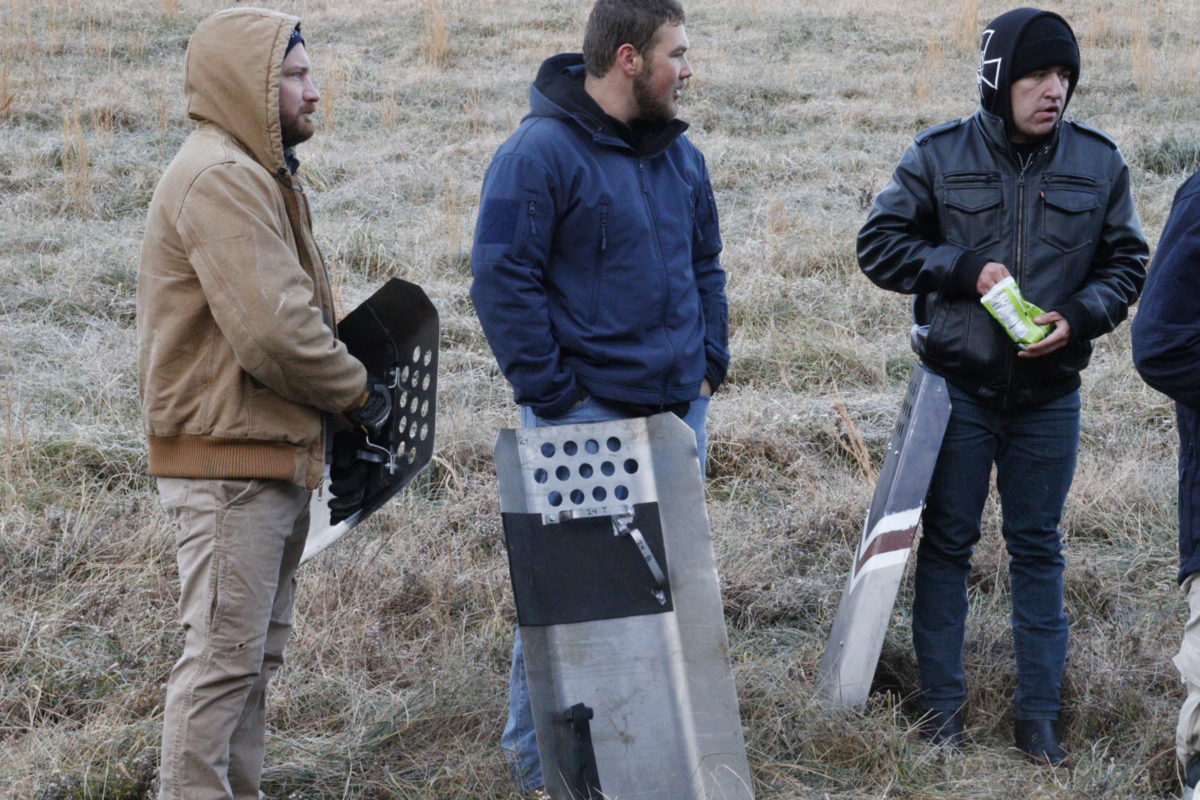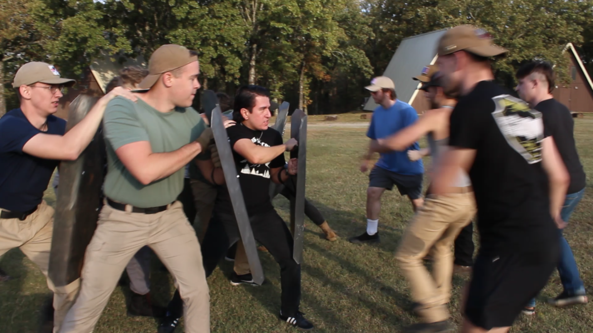 - Patriot Front’s drills show techniques for shield holding in columns of four.
