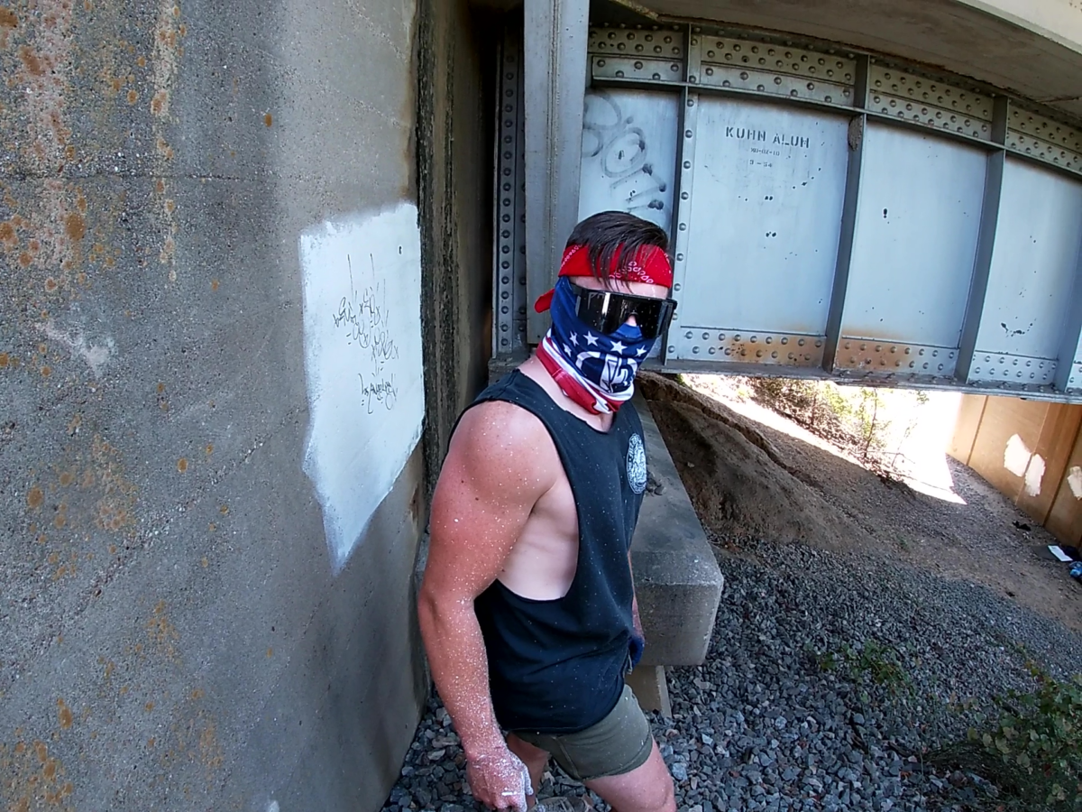 - Summary: 34 images and 7 videos of stencils and spray paint. Videos show two white men painting while a third person records. They are under an overpass in a grassy area.