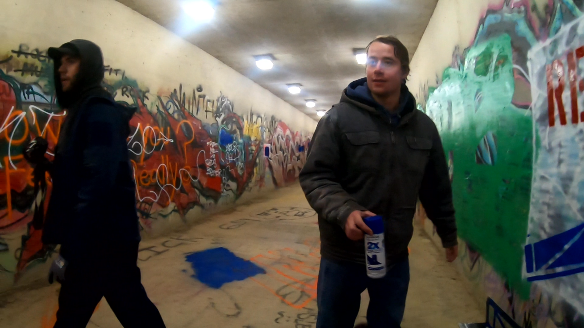 - Summary: Leaked photos and video (exif dated Nov. 13-14, 2021) of Patriot Front members stenciling in a heavily graffiti’d tunnel. Five Patriot Front members (including the cameraman who also participated in the spray painting) stenciled ‘Revolution is Tradition’ along with two fasces symbols. One member planning the graffiti before it happens tells the others to paint “over the gay shit.” They then make a point of covering up tags with LGBTQ themes before applying Patriot Front’s official stencil designs to the wall. Later on one member can be heard off-camera saying “I want you to destroy anything that is homosexual in this building.” The young men become particularly excited when they notice the opportunity to cover up a symbol they incorrectly believed to be a Star of David.