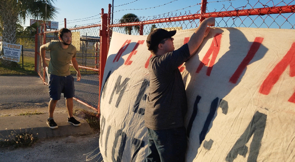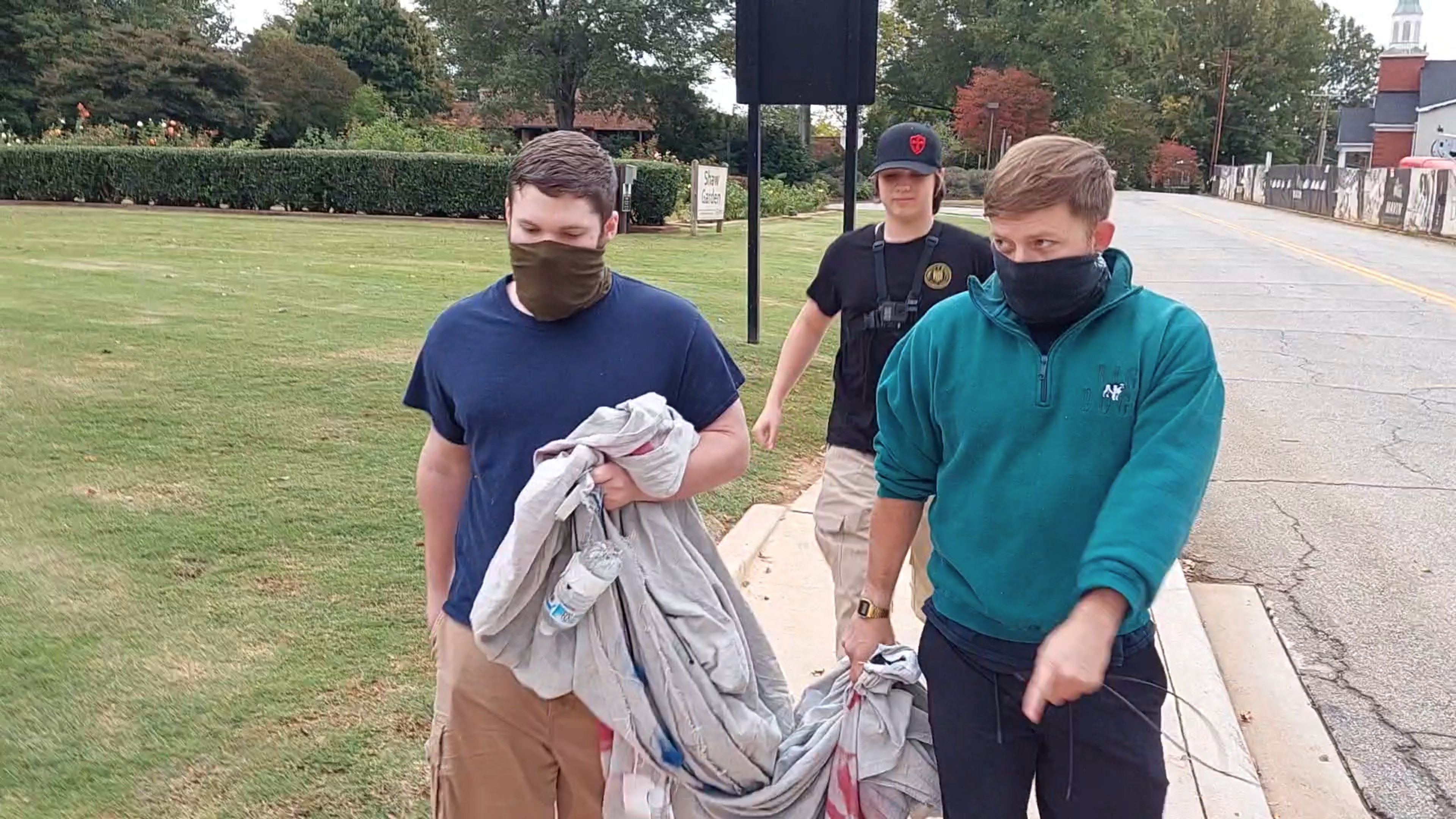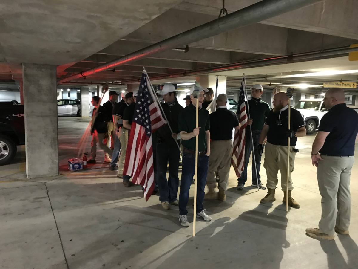 - Summary: Patriot Front members hang an ‘America First’ banner from an overpass.