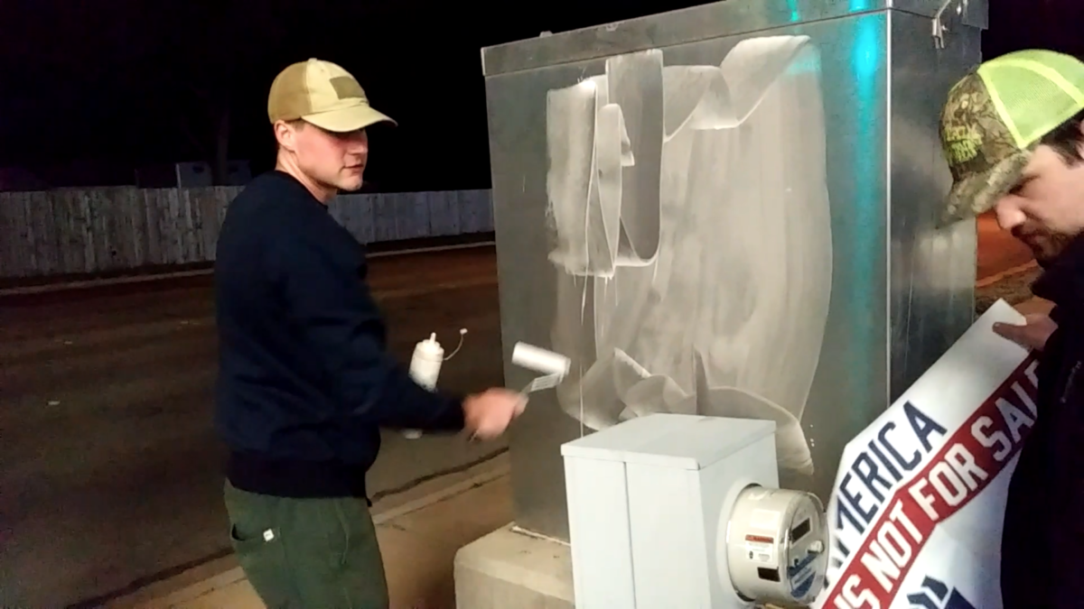 - VID_20211024_105919.mp4 shows Patriot Front members covering up a tag that says ‘gay rights’ (the cameraman also comments on noticing the pro-gay message.) They cover the tag with white paint and then spray a stencil over it to make it illegible.