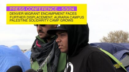 Denver, CO — On Friday afternoon, members from the unhoused migrant community, alongside organizers with Housekeys Action Network Denver (HAND), Colorado Palestinian Coalition (CPC), and Students for a Democratic Society hosted a press conference about an impending sweep of the encampment on May 8 and about the parallels with the newly established Palestine solidarity student encampment at the Auraria Campus.