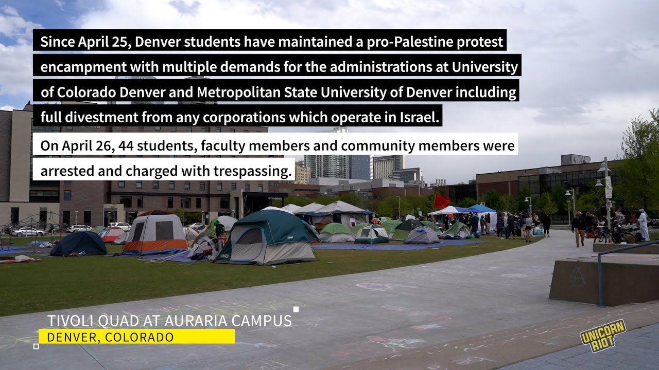 Since April 25, Denver students on the Auraria Campus have maintained a pro-Palestine protest encampment with multiple demands for the administrations at University of Colorado Denver and Metropolitan State University of Denver including full divestment from any corporations which operate in Israel. According to one of the student organizers, Khalid Hamu, the encampment was set up in response to the April 20 international call “to establish the Popular University of Gaza and to set up solidarity encampments for Gaza.”