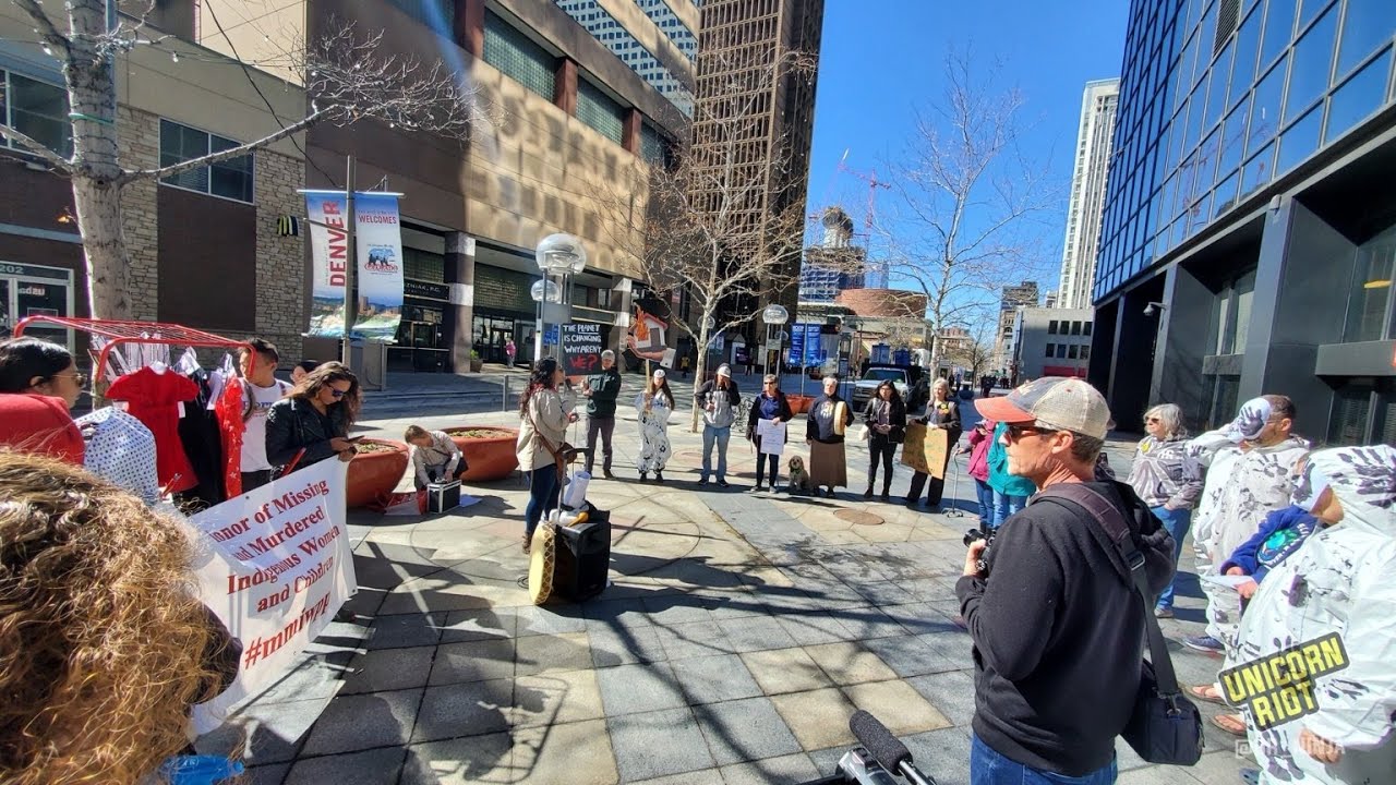 A coalition of environmental and Indigenous rights groups crowd the sidewalk outside the downtown Denver Energy Center where on the 26th floor, resides the Consulate General of Canada. As part of a solidarity call-to-action, activists hope to bring awareness to the Wet’suwet’en First Nation’s ongoing fights against the oil and gas industry, as well as, the continued over-stepping by the Royal Canadian Mounted Police (RCMP) and the Canadian government.