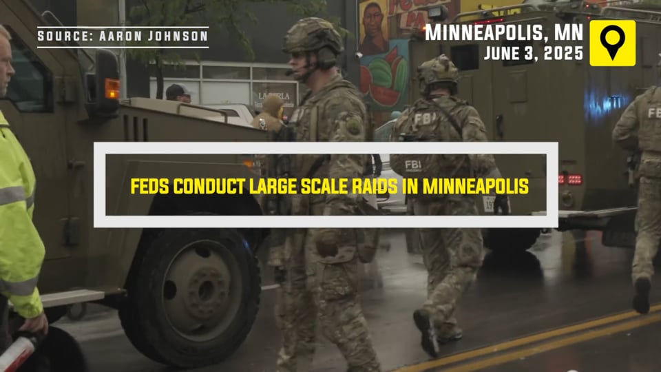 Dozens of federal agents in a newly minted federal task force raided a business on East Lake Street in South Minneapolis on Tuesday morning (June 3) and were quickly met with a raucous crowd amid toxic smoke conditions from Canadian wildfires. The crowd of up to 200 people grew through the day under the impression an immigration raid was underway, at times blocking federal vehicles from vacating alleys and streets. Federal agents responded violently by shooting pepper balls and unleashing pepper spray; personnel from the FBI and Immigration and Customs Enforcement (ICE) Special Response Teams (SRT) were filmed shoving people. Mobilized community members eventually pressured the federal agents out of the neighborhood, while Minneapolis police officers provided crowd control. Full story and more in links below.