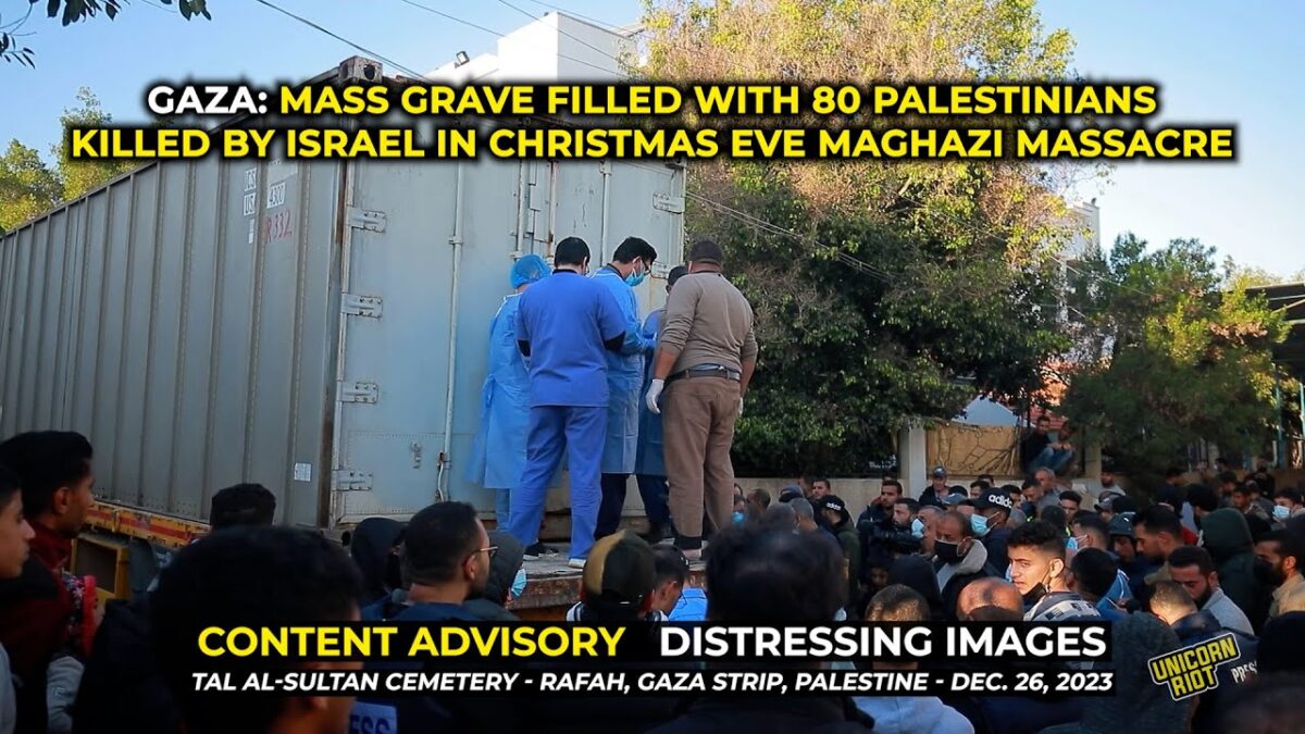 In one of Israel’s deadliest bombings since Oct. 7, the Christmas Eve massacre in Maghazi refugee camp in central Gaza killed ~100 Palestinians. 80 of the dead were buried in a mass grave at Tal Al-Sultan cemetery near Rafah a few days later. More on the massacre: https://unicornriot.ninja/2023/maghazi-massacre-israel-kills-over-100-civilians-in-christmas-eve-bombing/