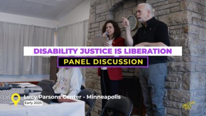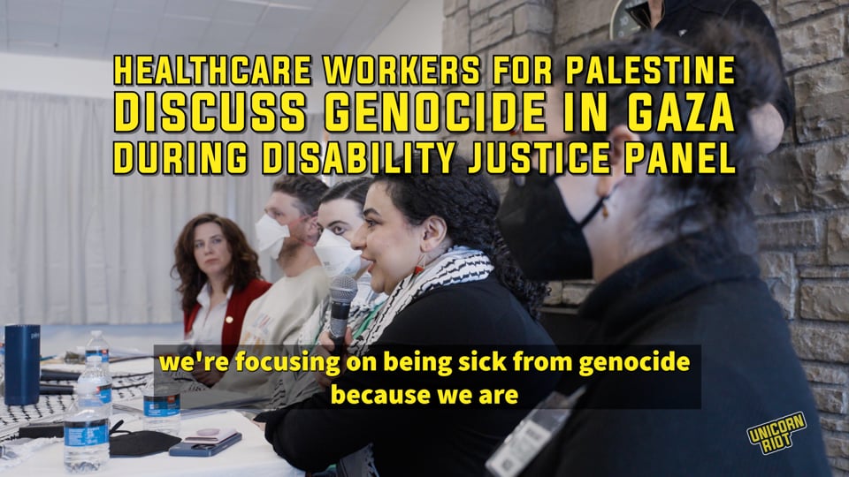 HCW4P organizers, Dr. Sam Sharp and Sulwa Nubani, referenced the ongoing genocide of Palestinians by Israel during a Disability Justice is Liberation panel discussion in early 2025. “We’re focusing on being sick from genocide because … we as a community have become sick from genocide,” said Nubani, a Palestinian-American psychiatry physician who also organizes with Doctors Against Genocide.