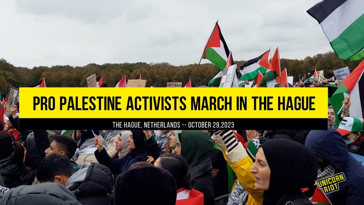 The Hague, Netherlands — A massive pro-Palestinian demonstration marched around the center of The Hague this Sunday, where organizers and protesters were calling for an immediate ceasefire in the besieged Gaza Strip, for the Dutch government to cut ties with Israel, and for the International Criminal Court to investigate Israeli leaders for war crimes. It was likely the largest protest yet in the Netherlands since Israel’s assault on Gaza began following the October 7 Hamas offensive.
