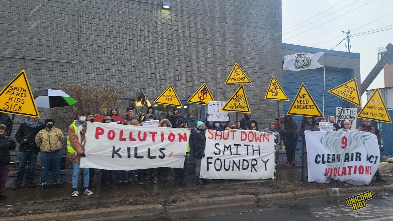 About 40-50 activists & East Phillips residents gathered amid a rain/snow storm in Minneapolis today calling on the Smith Foundry to be shut down. The iron-casting facility has been found to violate health regulations. A recent EPA inspection found the plant emits twice the legal limit of lead.