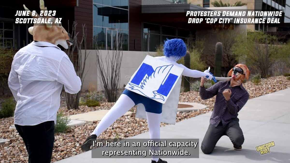 Scottsdale, AZ – Costumed protesters staged a mock cancellation of Scottsdale Insurance contract with the Atlanta Police Foundation building ‘Cop City’ in a street theater demonstration held outside the offices of Scottsdale Insurance (a Nationwide subsidiary) on June 8, 2023: https://unicornriot.ninja/2023/cop-city-protesters-visit-nationwide-insurance/