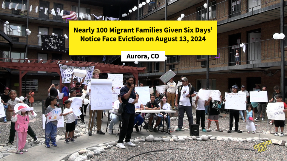 Nearly 100 Migrant Families Given Six Days’ Notice Face Eviction on August 13, 2024 August 10, 2024 🦄 Borders & Migration , 🦄 Land & Housing Single story posts page footer widgets mobileYour Source For Independent Media – No Ads or Paywalls – Viewer Supported Related posts and coverage: Dozens of Migrant Families Face Eviction in Aurora, CO with Less Than One Week’s Notice • August 8, 2024 Main video URL: Vimeo. See more videos & media like this: Video Gallery • For all videos check out the new Media Library. Also at: YouTube