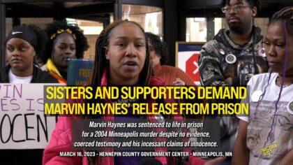 “We are asking for his immediate release!” Cynthia Haynes demanded passionately, calling for her brother’s release from prison while holding two signs – one read “Free Marvin Haynes Now,” the other, “Justice 4 Marvin Haynes.” As the case of Marvin Haynes starts to gain more media attention, family and supporters held a press conference demanding he be freed from prison. On March 16, 2023, Haynes’ family and advocates gathered in the atrium of the Hennepin County Government Center in downtown Minneapolis and addressed the media.
